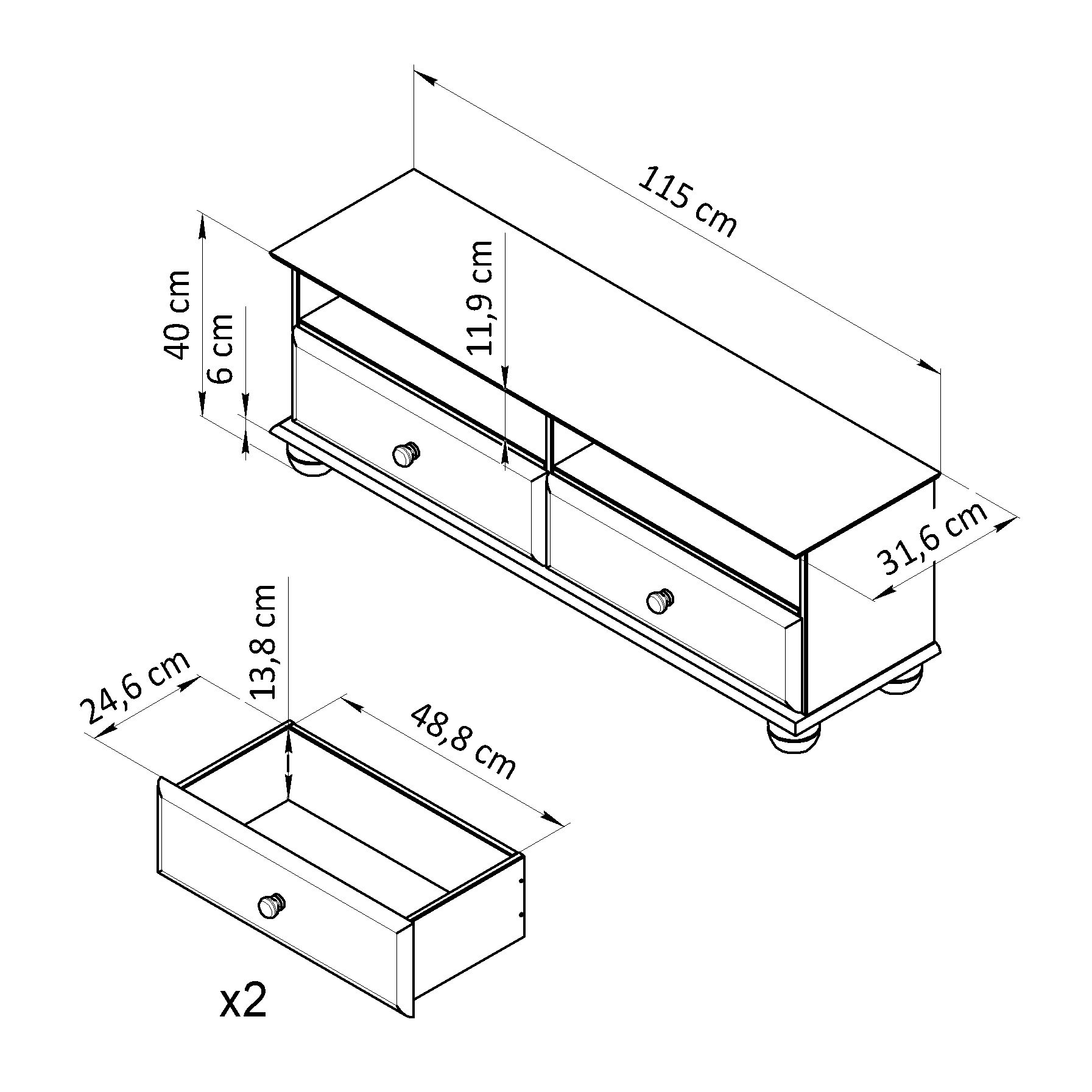 Уникальными преимуществами являются экологичная и устойчивая конструкция, благодаря чему тумбу можно разместить во многих помещениях. Наличие 2 выдвижных ящиков и 2 полок позволяет с легкостью выполнять уборку и хранить вещи. Выдвижение ящиков происходит с использованием роликовых направляющих длиной 250 мм, которые поставляются в комплекте. Внутренние размеры ящиков: Ширина х Глубина х Высота - 49х24.5х13.5 см, позволят вам без труда организовать пространство и хранить вещи в аккуратном порядке, а максимальная нагрузка на ящик составляет 5 кг. Толщина дерева крышки, дна и фасада дверей составляет 18 мм; стенок, перегородок, полок и стенок ящика - 14 мм. Задняя стенка тумбы и дно ящика выполнены из ДВП толщиной 3 мм. Высота ножек тумбы составляет 5 см. В ящиках используются деревянные ручки кнопки 34 мм.