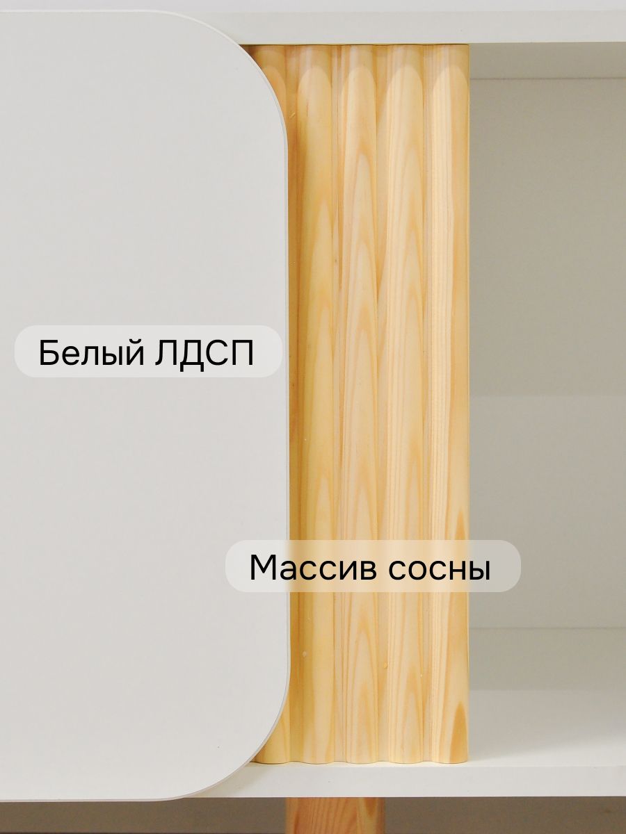- Экологичные материалы — декоративные резные фасады из массива сосны и устойчивое ЛДСП для корпуса.