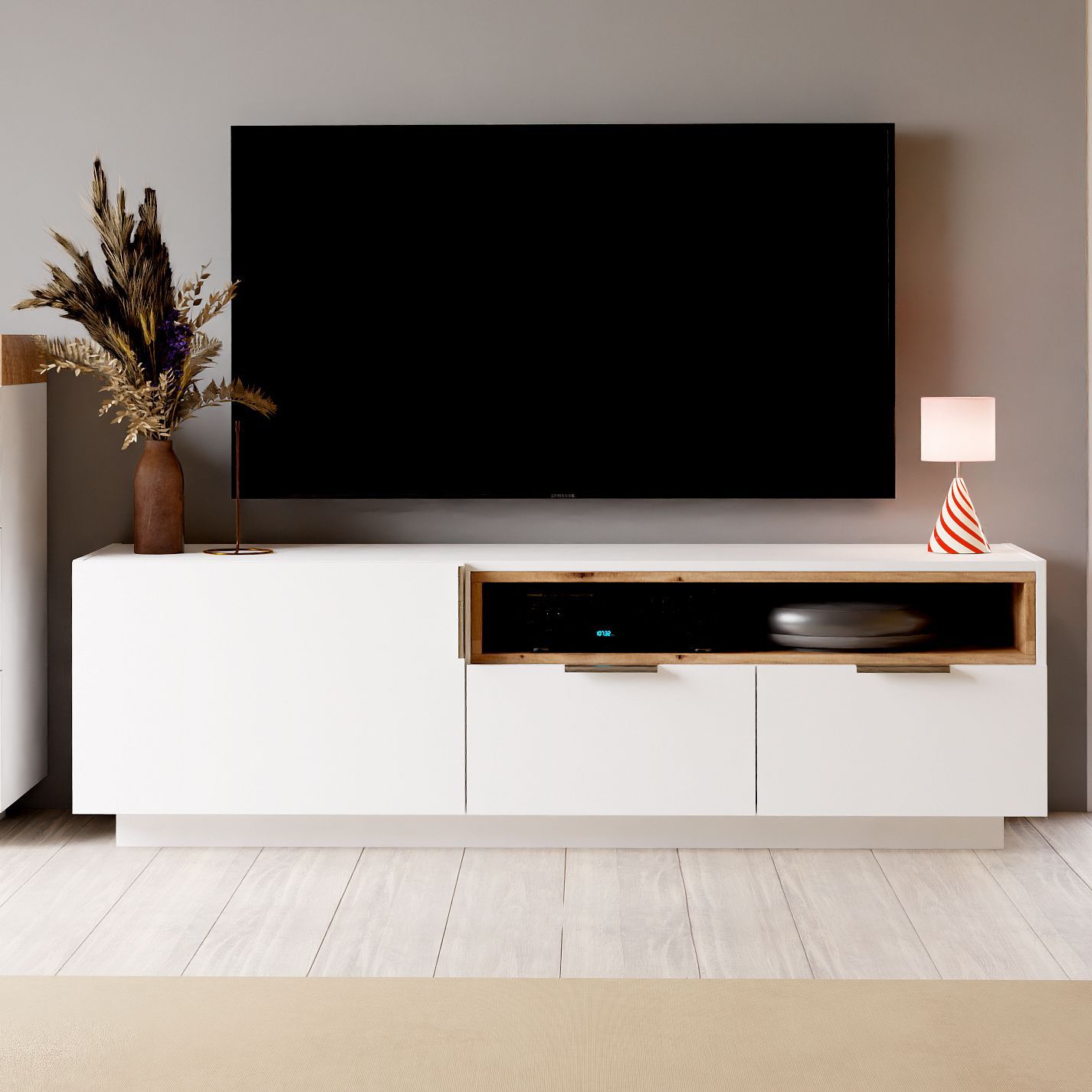 Удобные металлические ручки и система открывания дверей с доводчиками облегчает ежедневное использование. Главной особенностью тумбы под тв является парящая конструкция, создавая ощущения левитации над землей. Кроме того, комод оснащен удобной нишей, в которой можно разместить все, что угодно: от личных вещей и аксессуаров до журналов, детских игрушек, приставки и электроники.