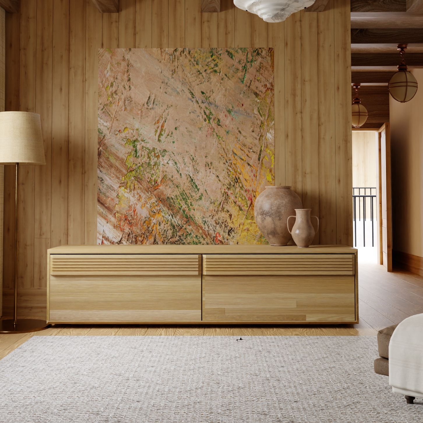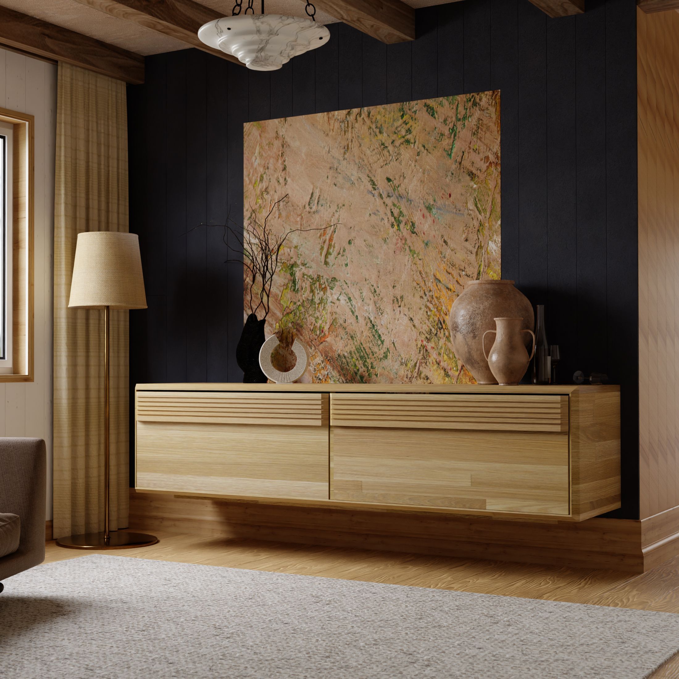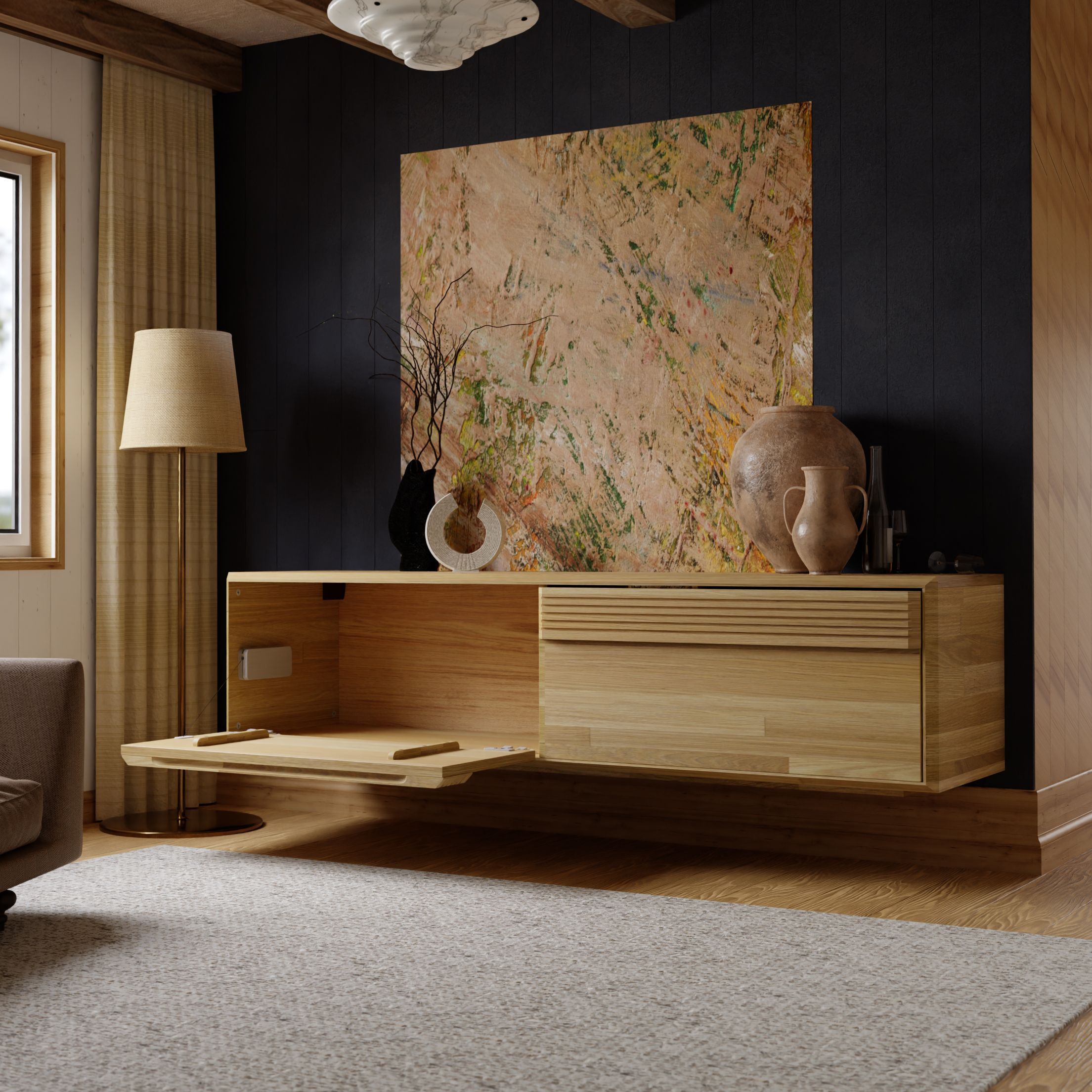 3) Двойная установка: Серия предлагает вам выбор в установке мебели. Каждое изделие можно установить как настенно, что создает ощущение свободного пространства, так и напольно, что придает дополнительную структуру и стабильность. Этот дизайнерский прием позволяет вам настроить гостиную под ваши потребности и вкусы.