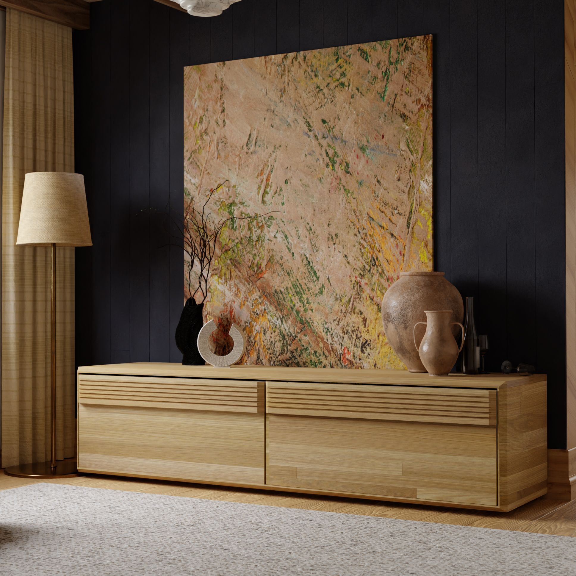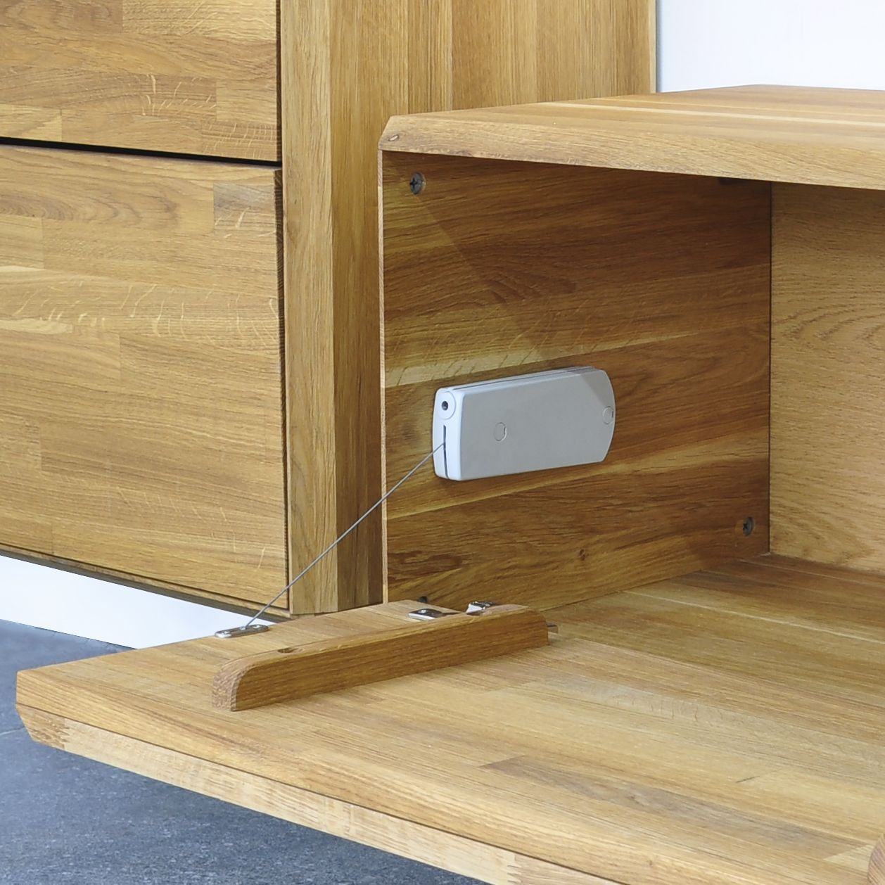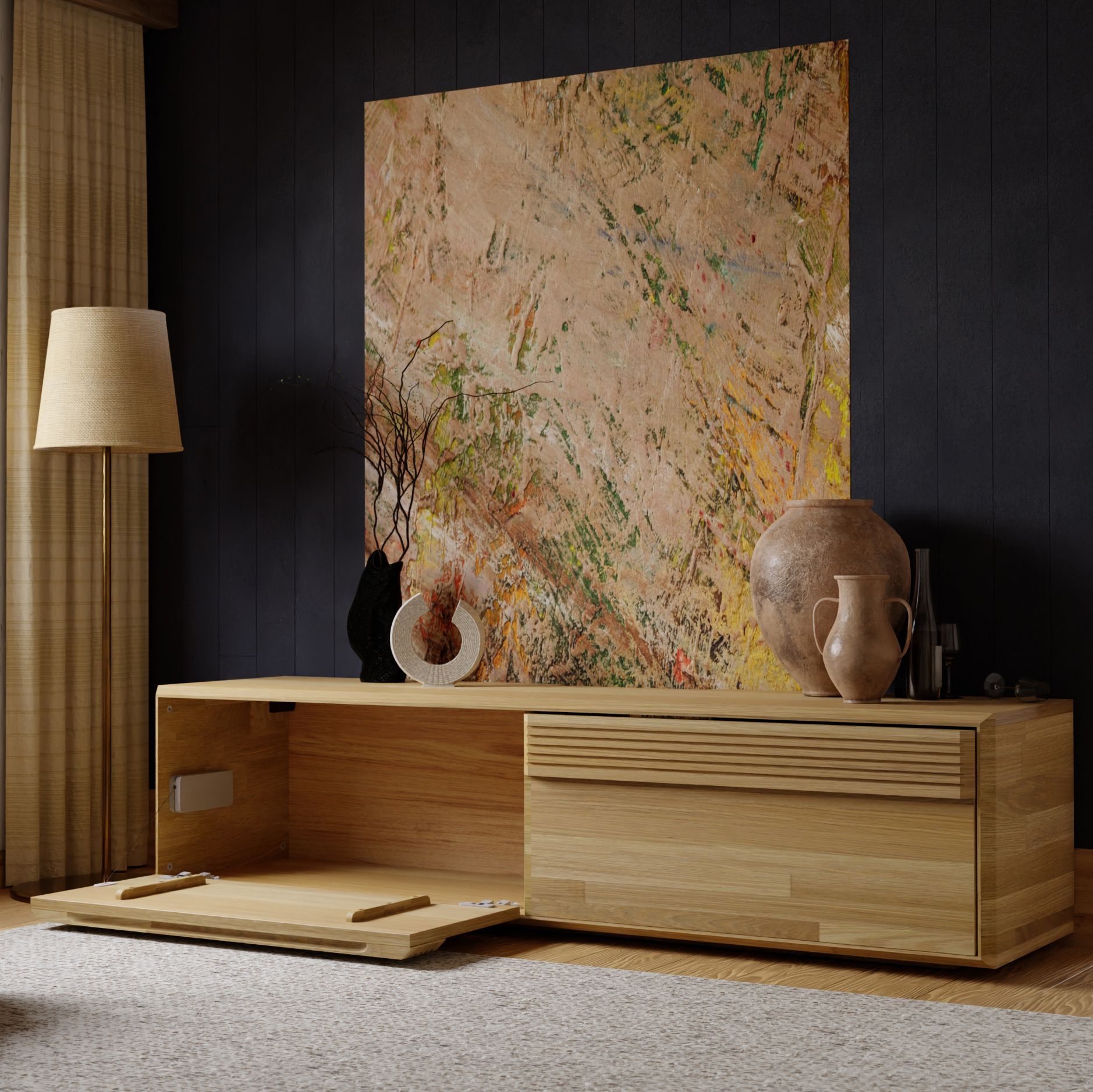 Тумба под телевизор серии Михаэлла - изящное украшении стенки гостиной. Тумба изготовлена из массива дуба с задней стенкой из фанеры. В качестве покрытия используется экологически чистое маслом для дерева, которое сохраняет структуру дерева и делает ее более яркой и насыщенной. Декоративная ручка с углублением для руки украшена изящной фрезеровкой, которая придает тумбе визуальный объем. Дверцы тумбы легко откидываются вниз. Петли изготовлены известным производителем BLUM, который гарантируют плавный и тихий ход дверцы при открывании и закрытии. У тумбы 2 вида установки - настенное и напольное. Крепление к стене идет в комплекте. В конструкции тумбы предусмотрено отверстие выхода для проводов телевизионной аппаратуры. Подсветка тумбы под ТВ - один из ключевых элементов образа гостиной стенки Михаэлла, поэтому она идет в комплекте к тумбе.