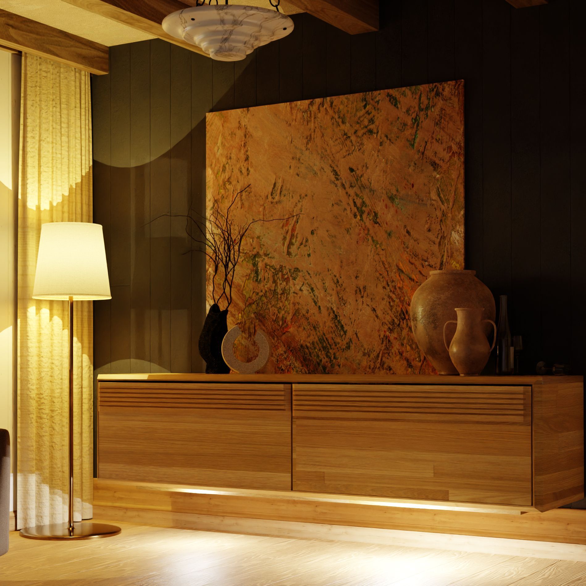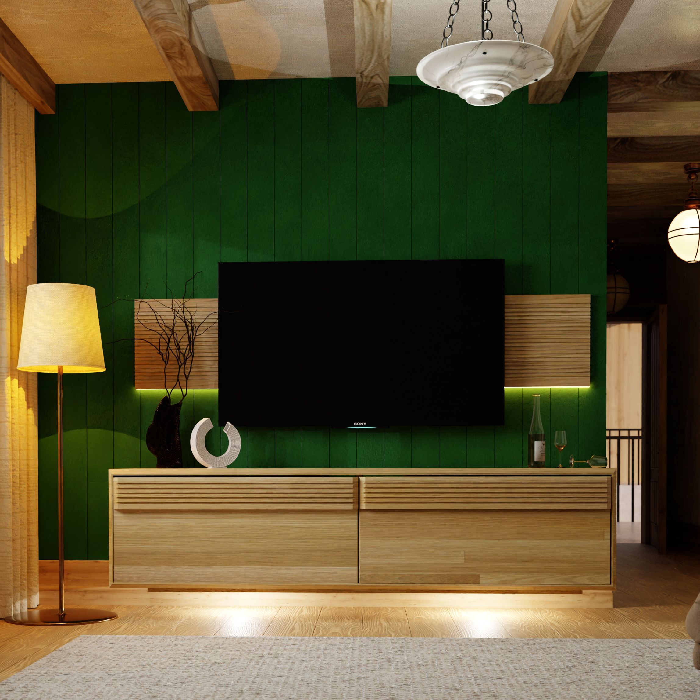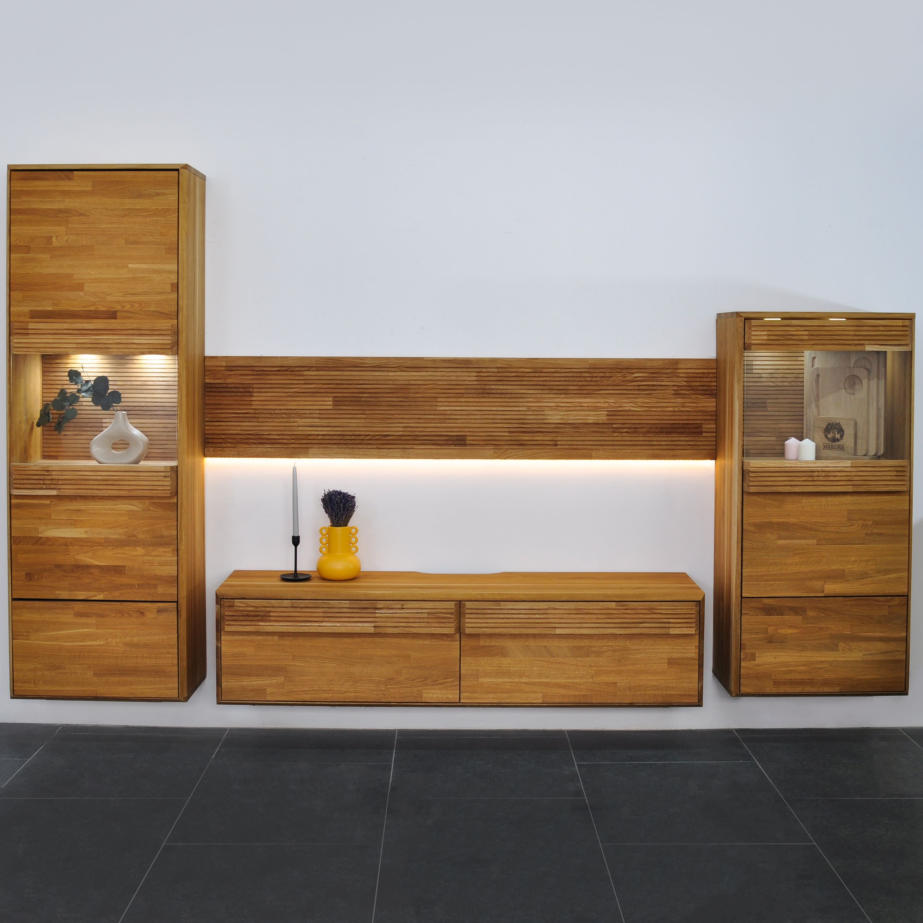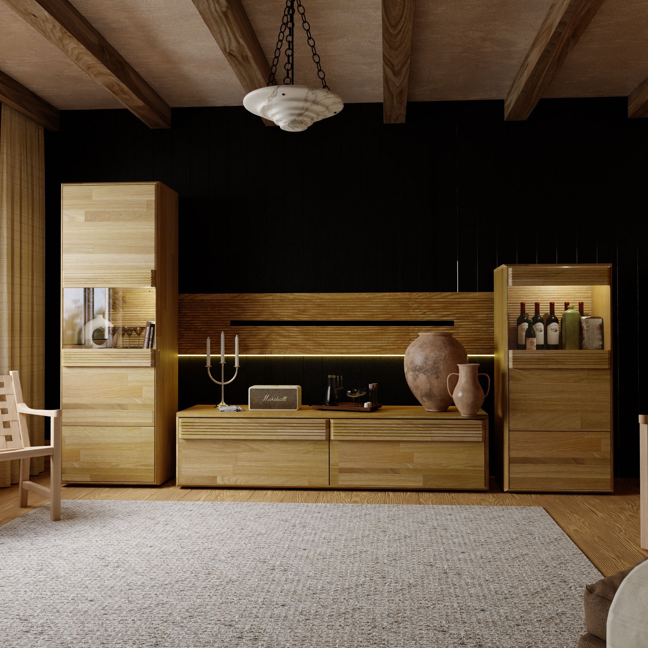 2) Подсветка: Каждое изделие серии "Михаэлла" оснащено подсветкой, которая придает вашей гостиной уют и атмосферу. Мягкое, рассеянное освещение подчеркивает красоту дерева и создает неповторимый эффект вечерней атмосферы.