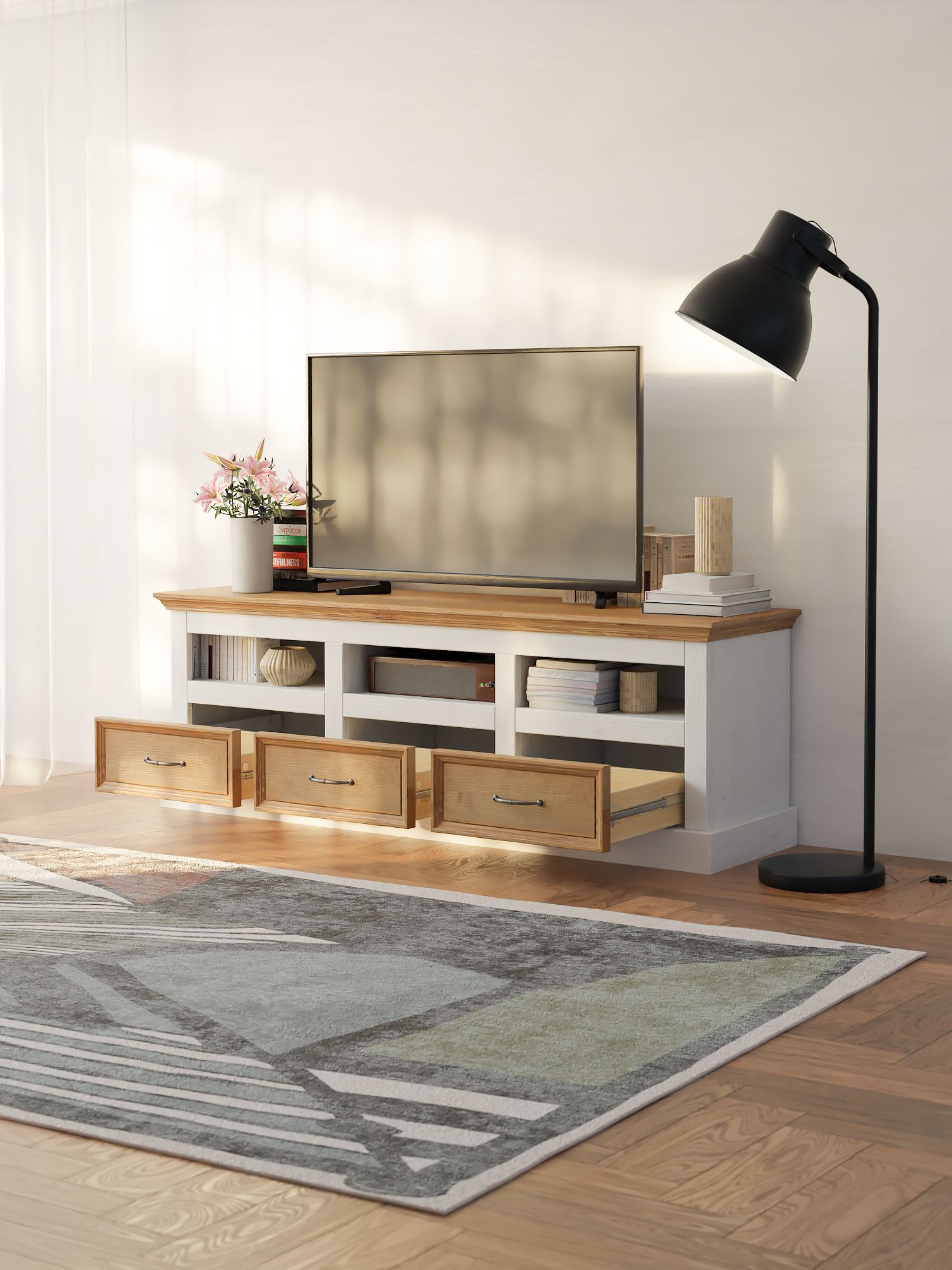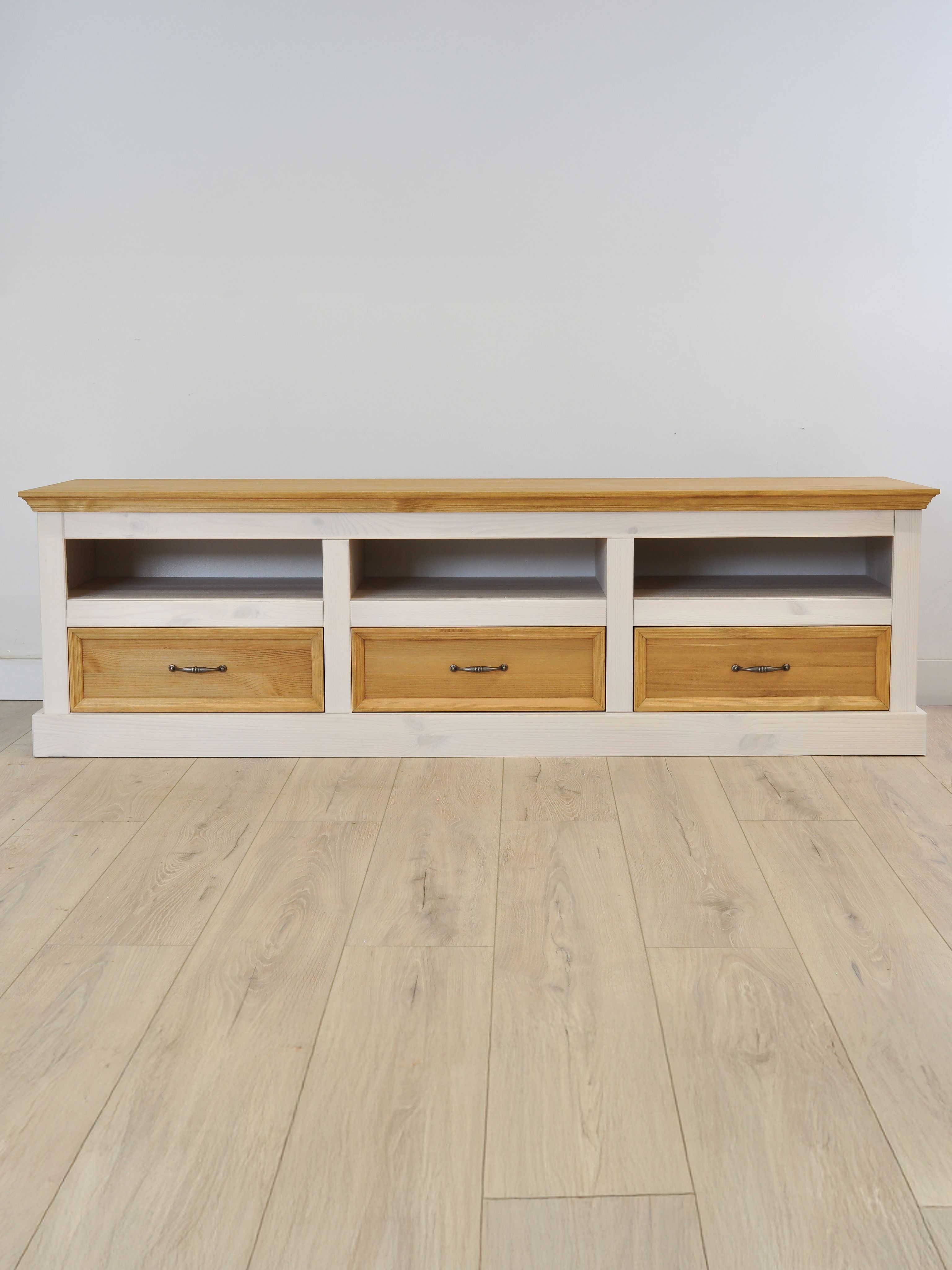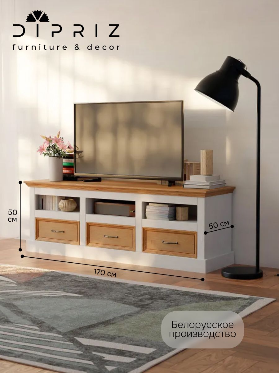 Три вместительных ящика обеспечивают удобное хранение необходимых вещей. Ящики с 100% открыванием обеспечивают максимальный доступ к содержимому, делая хранение удобным и практичным. Тумба сочетает многофункциональность, предлагая не только три просторных ящика, но и три глубокие полки, обеспечивающие удобное хранение различных вещей. Так же, верхняя поверхность достаточно просторна, чтобы разместить телевизор, декоративные элементы или аудиосистему.