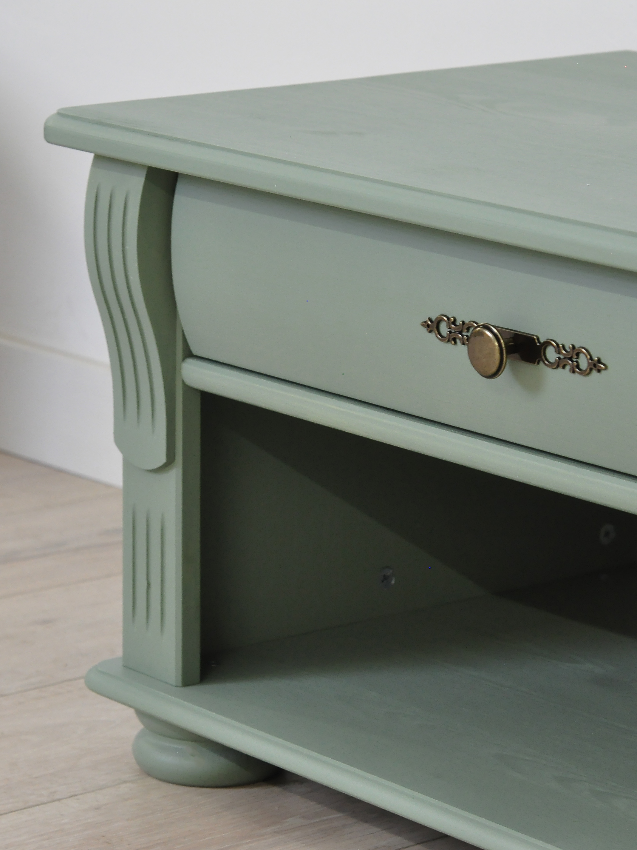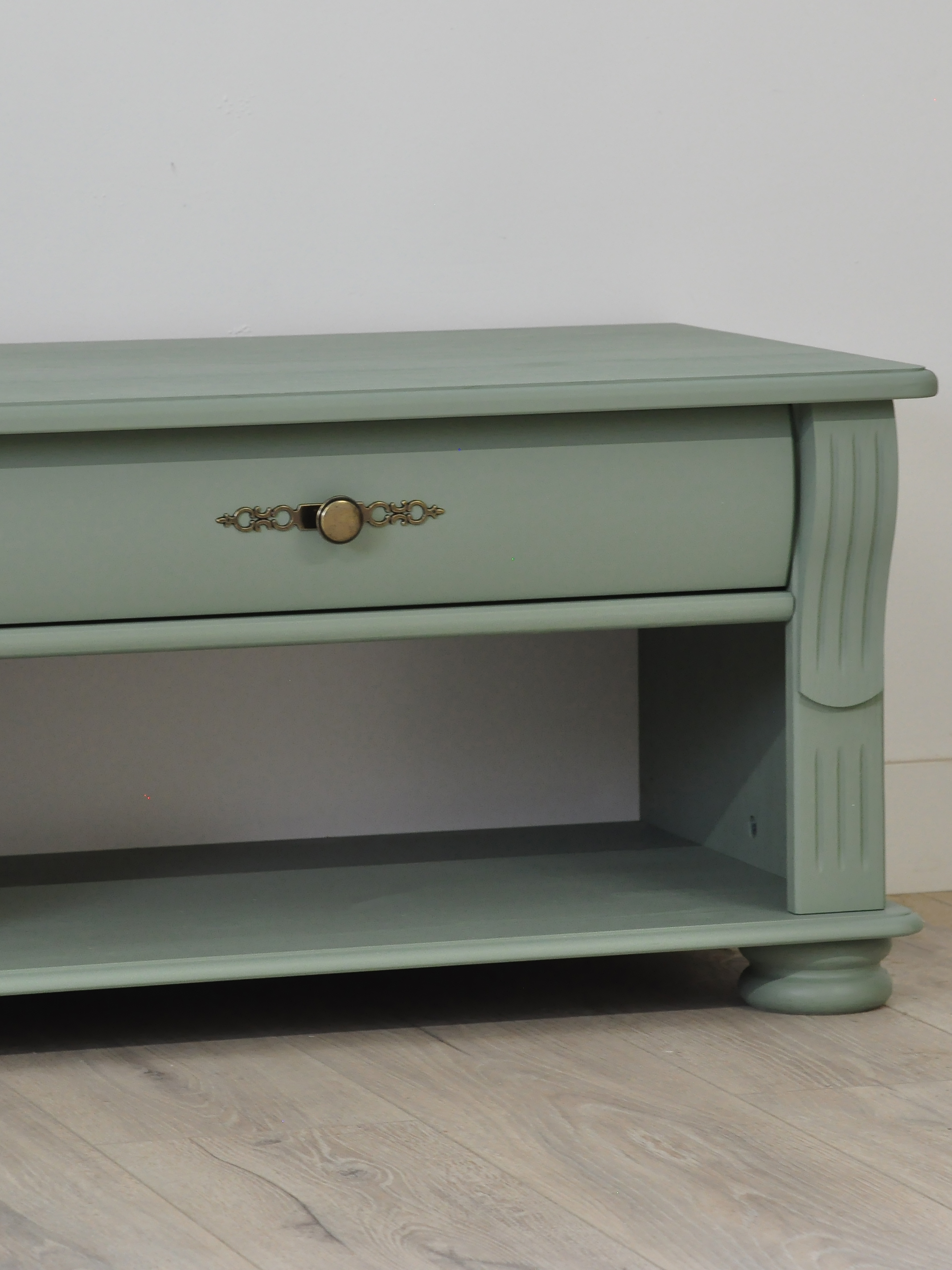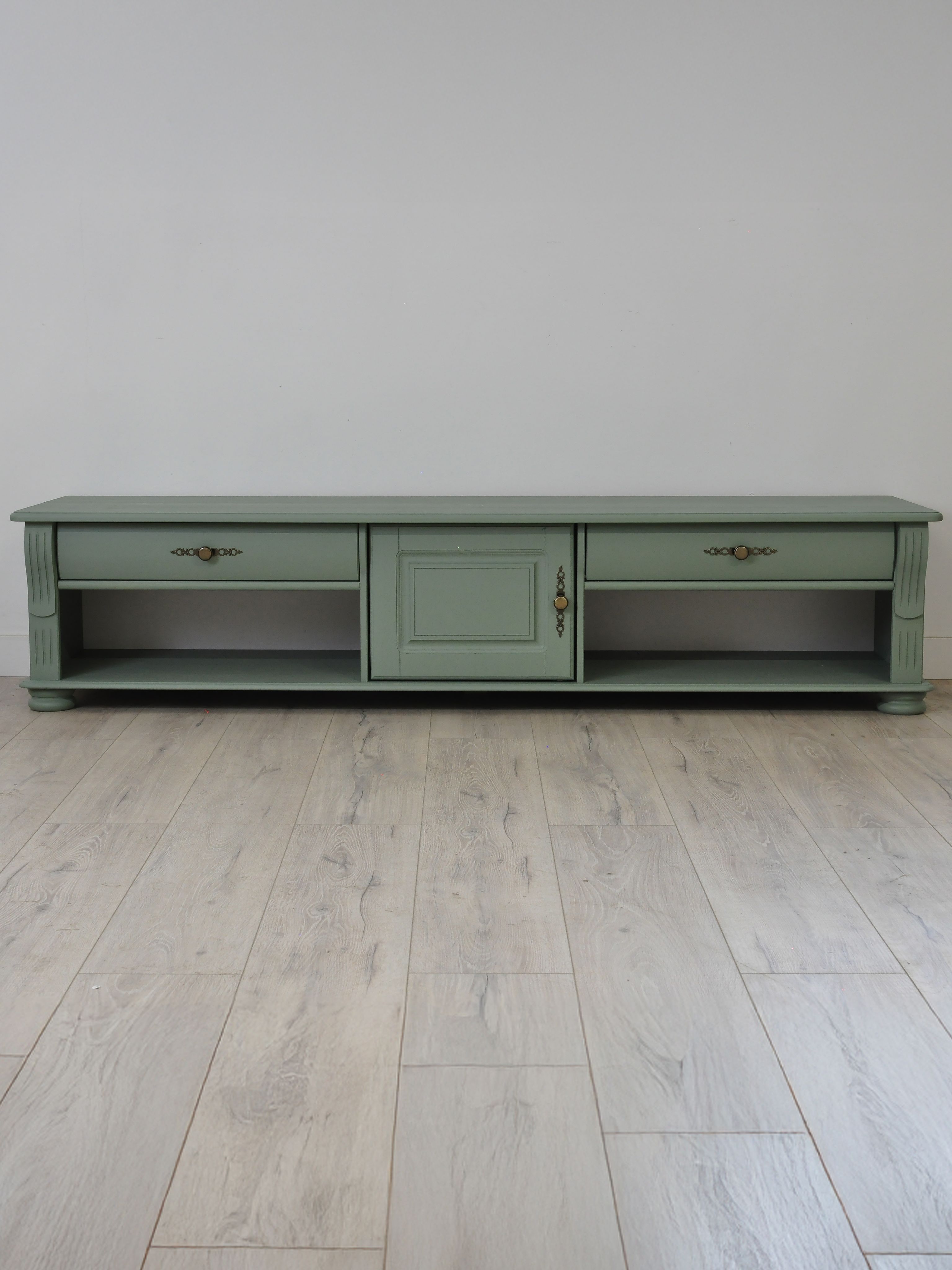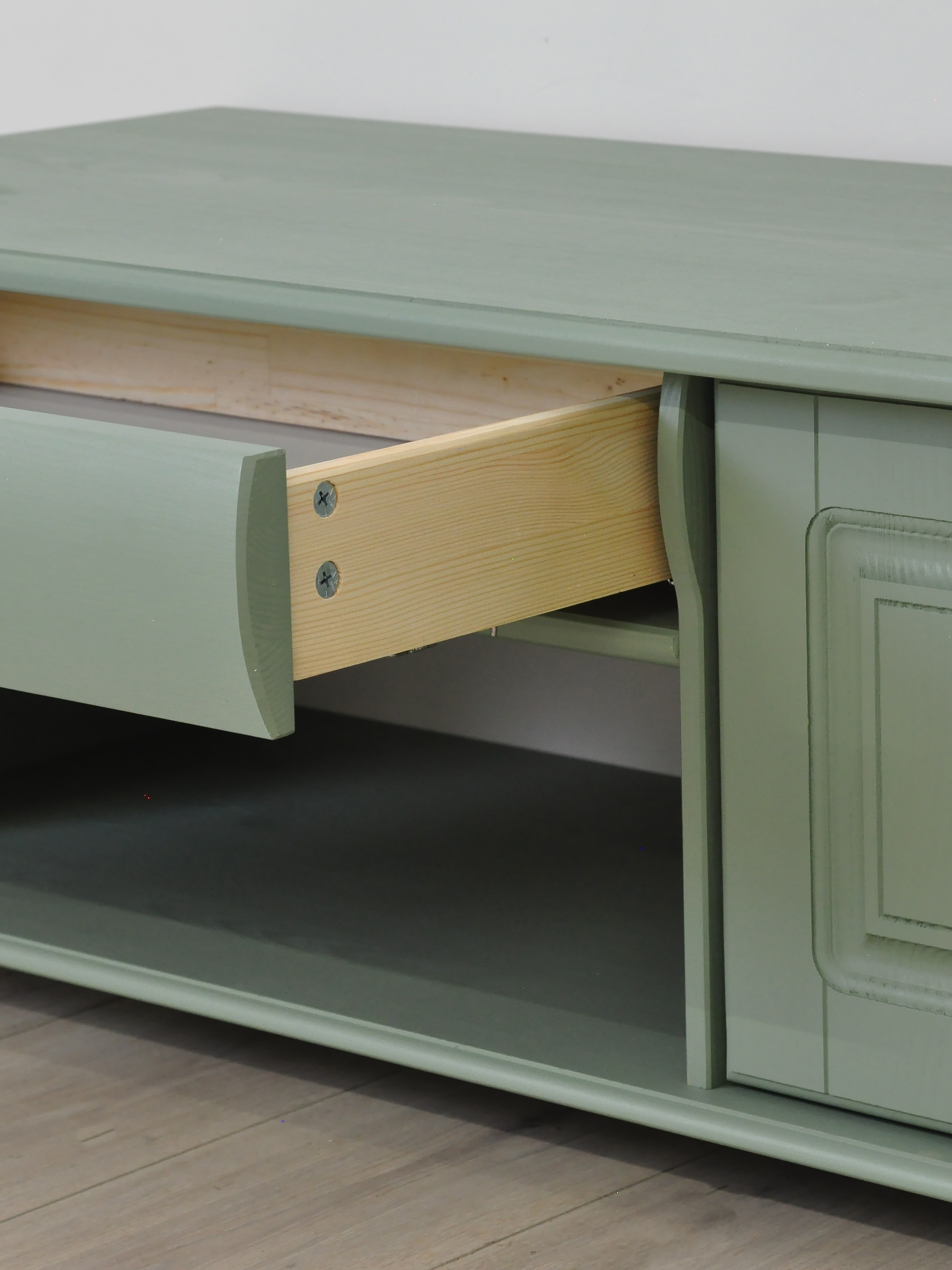 Тумба под телевизор 180 см напольная с ящиками и полками изготовлена из натурального массива сосны на деревянных ножках для устойчивости. Поверхность и края изделия гладко отшлифованы. Все фаски деревянного корпуса были сглажены с целью предотвращения случайных ударов или зацепов. Имеет скандинавский зелёный цвет натурального массива сосны за счет качественной обработки, поэтому приятный запах и полезные свойства дерева сохранены.