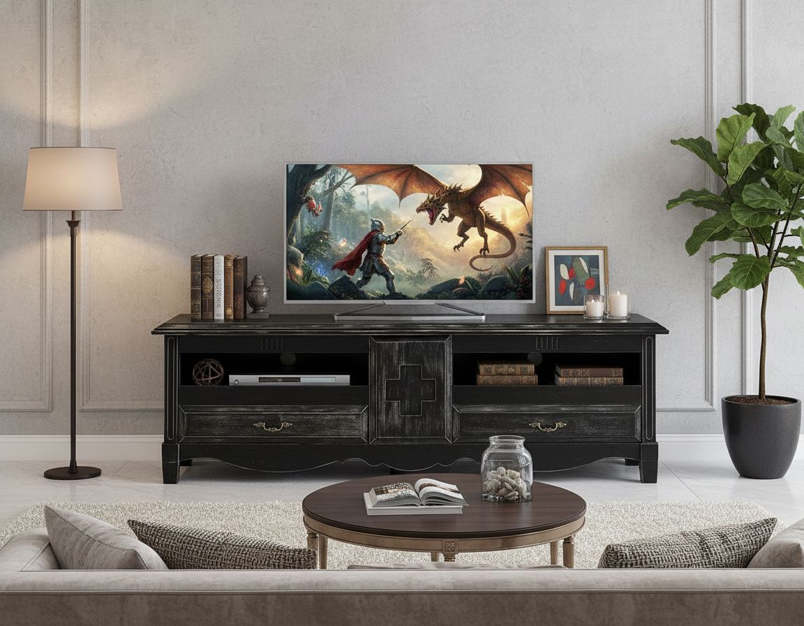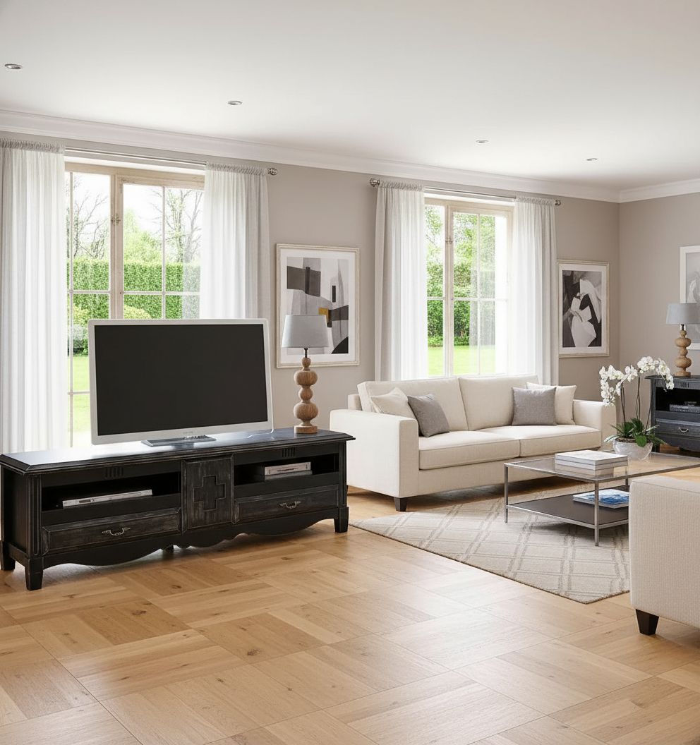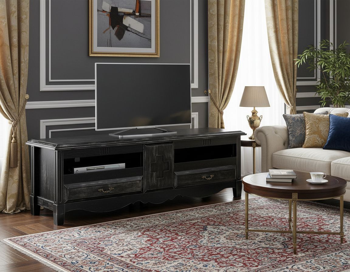 Тумба воплощает традиции классического европейского дизайна с современным пониманием функциональности. Искусственно состаренные грани создают благородное винтажное впечатление, наделяя изделие характером и индивидуальностью. Такая мебель не только служит подставкой для техники — она становится центральным элементом медиазоны, демонстрируя изысканный вкус и чувство стиля.