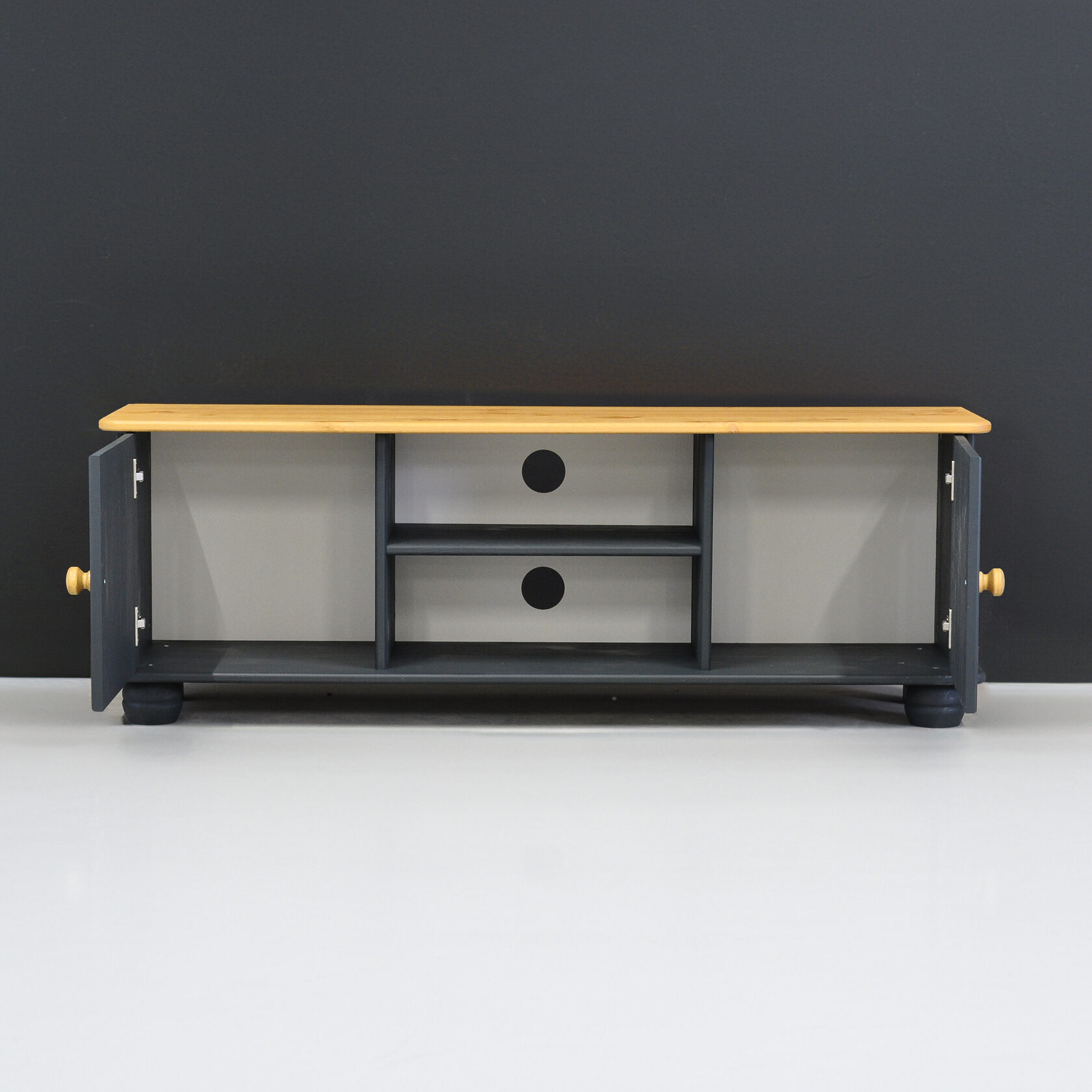 - Функциональный дизайн: Размеры тумбы (115х29х40 см) включают 2 дверцы и открытую нишу с полкой для проигрывателей и приставок, а также скрытые вырезы для кабелей на задней стенке.