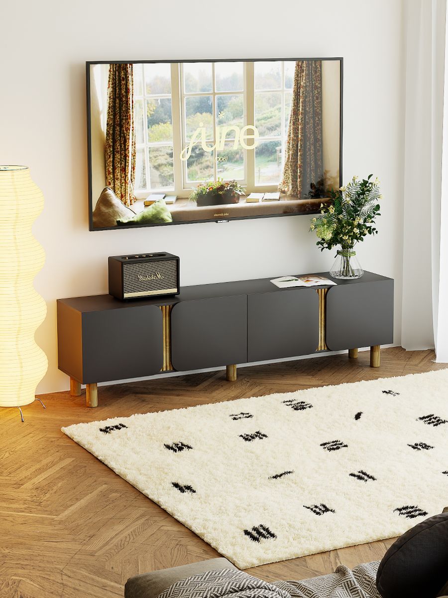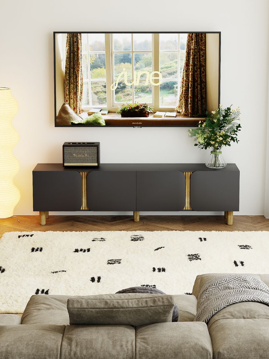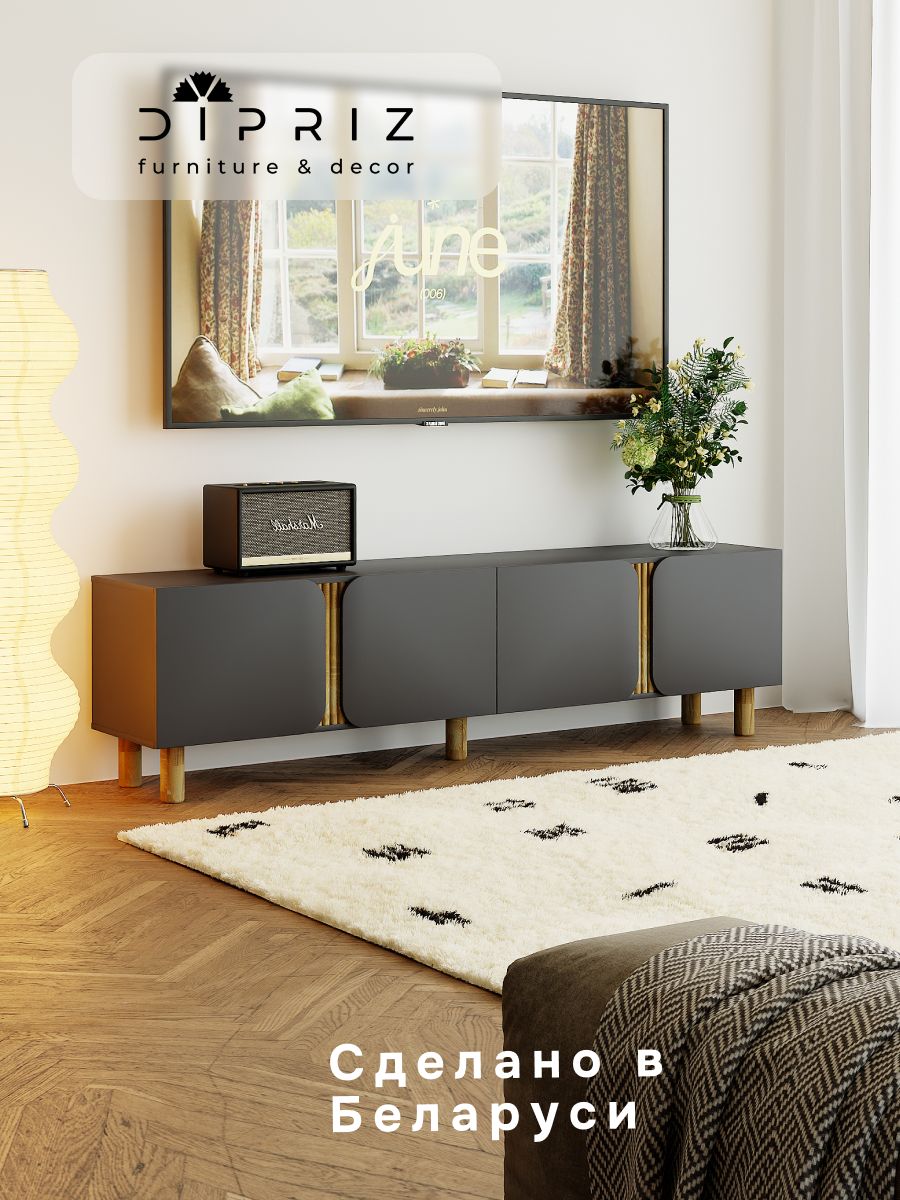 Изготовленная из качественных материалов, она гарантирует устойчивость и долговечность. Дверцы тумбы дополнены надежными доводчиками и выполнены без ручек, создавая утонченный вид фасада. Ножки из сосны, на которых располагается тумба, придают ей легкость и элегантность. Данная модель прекрасно подходит под телевизор, создавая комфортное пространство для просмотра ваших любимых фильмов и сериалов.