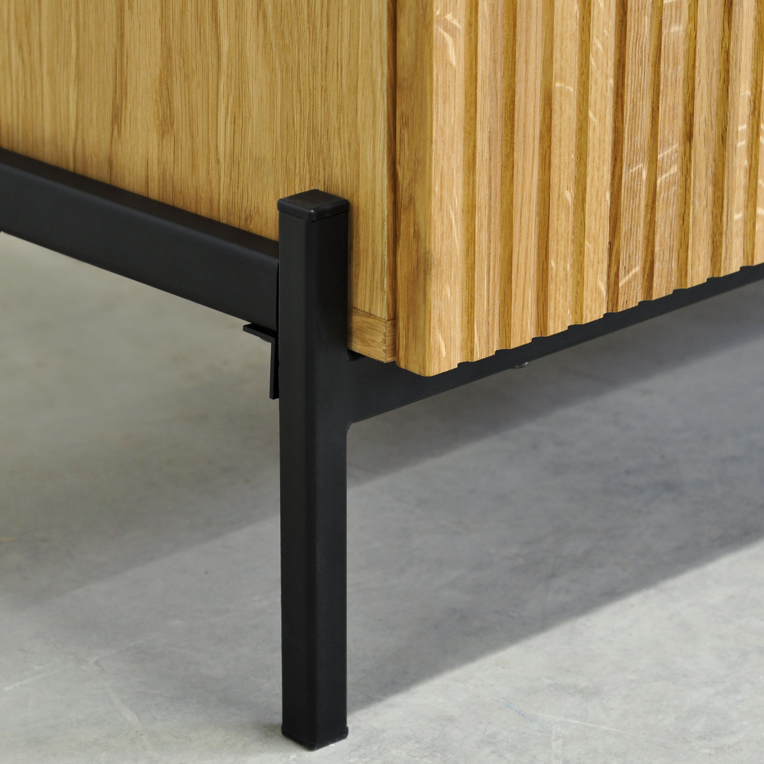 Тумба Грувс - сочетание брутальной эстетики лофта и роскоши ар-деко. Фасады из цельного массива дуба с геометрическими фрезеровками, корпус из шпона дуба и надежные металлические ножки создают мебель, которая прослужит десятилетиями. Произведено в Беларуси.