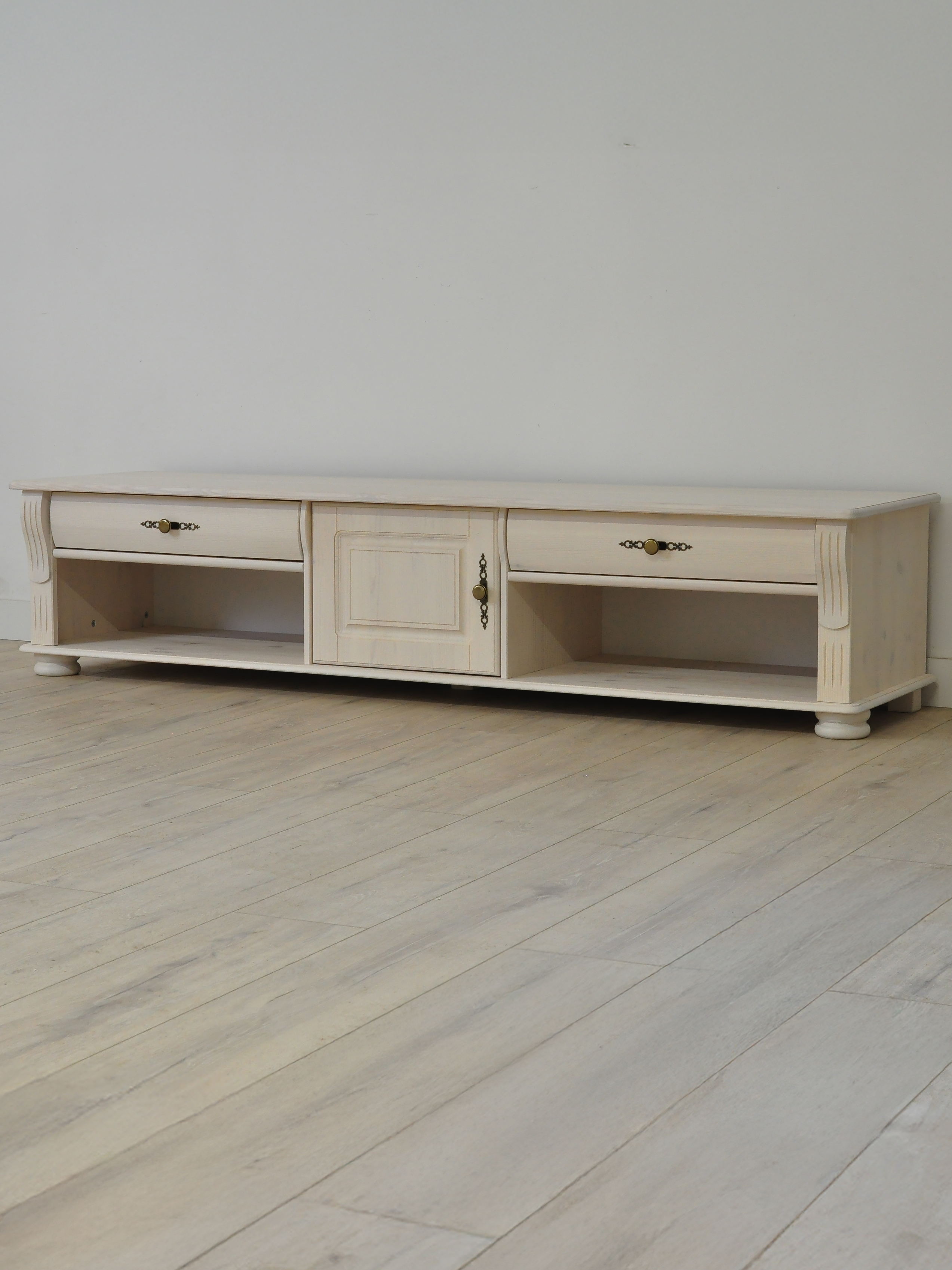 Тумба под телевизор 180 см напольная с ящиками и полками изготовлена из натурального массива сосны на деревянных ножках для устойчивости. Поверхность и края изделия гладко отшлифованы. Все фаски деревянного корпуса были сглажены с целью предотвращения случайных ударов или зацепов. Имеет скандинавский белый цвет натурального массива сосны за счет качественной обработки, поэтому приятный запах и полезные свойства дерева сохранены.