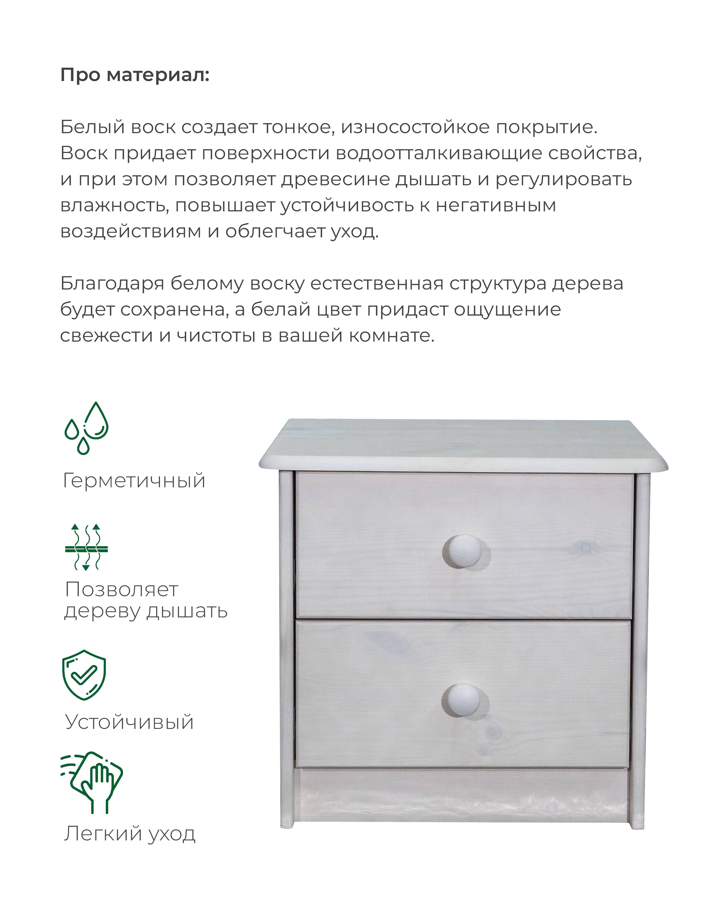 Прикроватная тумба Хаба от белорусского производителя мебели "Диприз" изготовлена из массива сосны с использованием экологически чистых отделочных материалов. Отделка товара - белый воск, это означает, что покрытие тонирует основание, скрывая текстуру дерева. Данный вид отделки создает необходимый защитный слой, такое покрытие хорошо сохраняет структуру натурального дерева и позволяет свободно эксплуатировать поверхность мебели во влажной среде. Покрытие относится к натуральным на водной основе и соответствует всем требованиям экологичности. Белоснежный вид изделия и тонкий, едва уловимый, запах сосны создадут ощущения тепла и комфорта, а также добавят чистоты и свежести окружающей обстановке. Изделие выглядит стильно и современно. Его классический дизайн легко может вписаться в любой интерьер квартиры, загородного дома, дачи, гостиницы или хостела. Благодаря своим небольшим размерам занимает немного пространства. В двух выдвижных ящиках достаточно места для хранения вещей, которые могут понадобиться во время сна. Гарантия 24 месяца