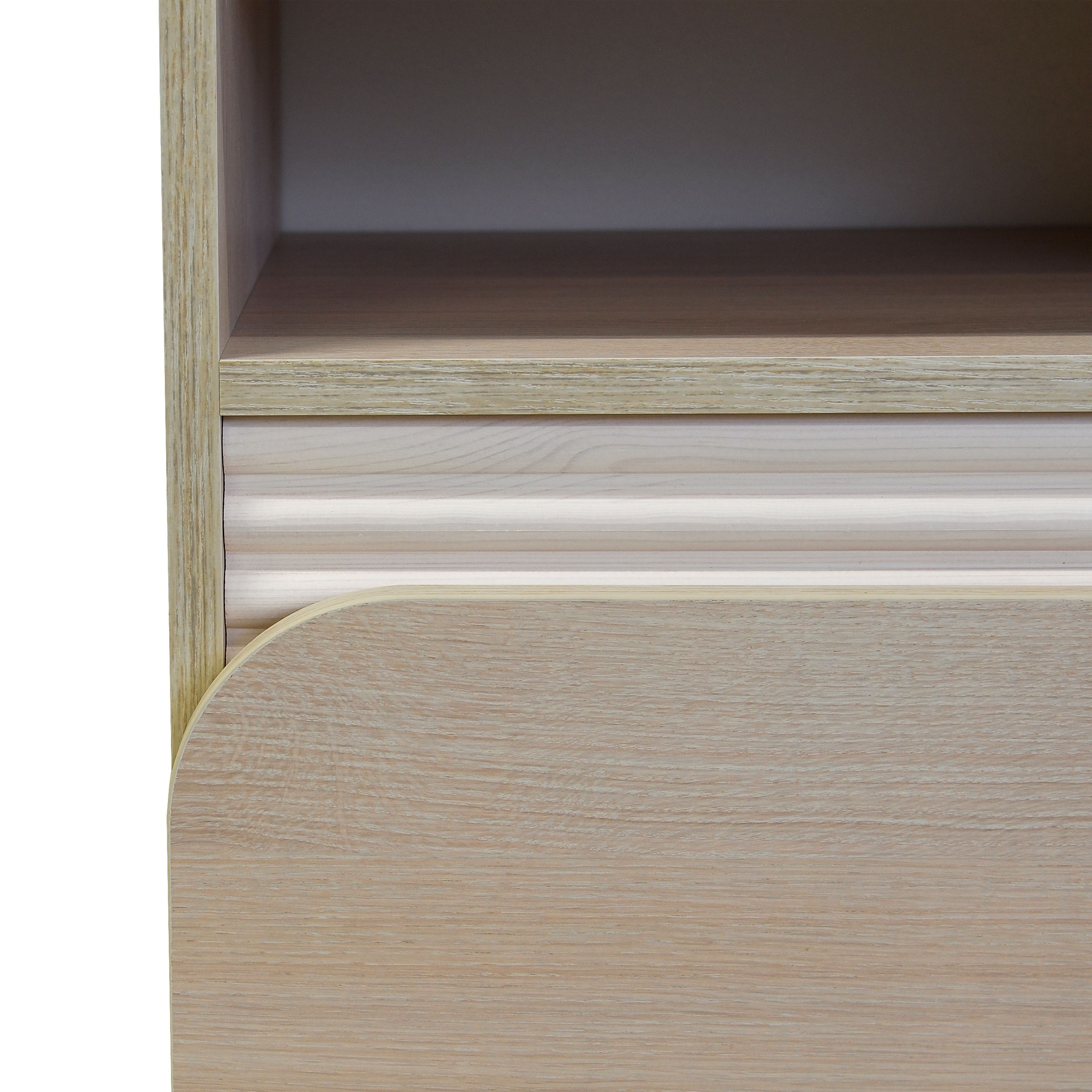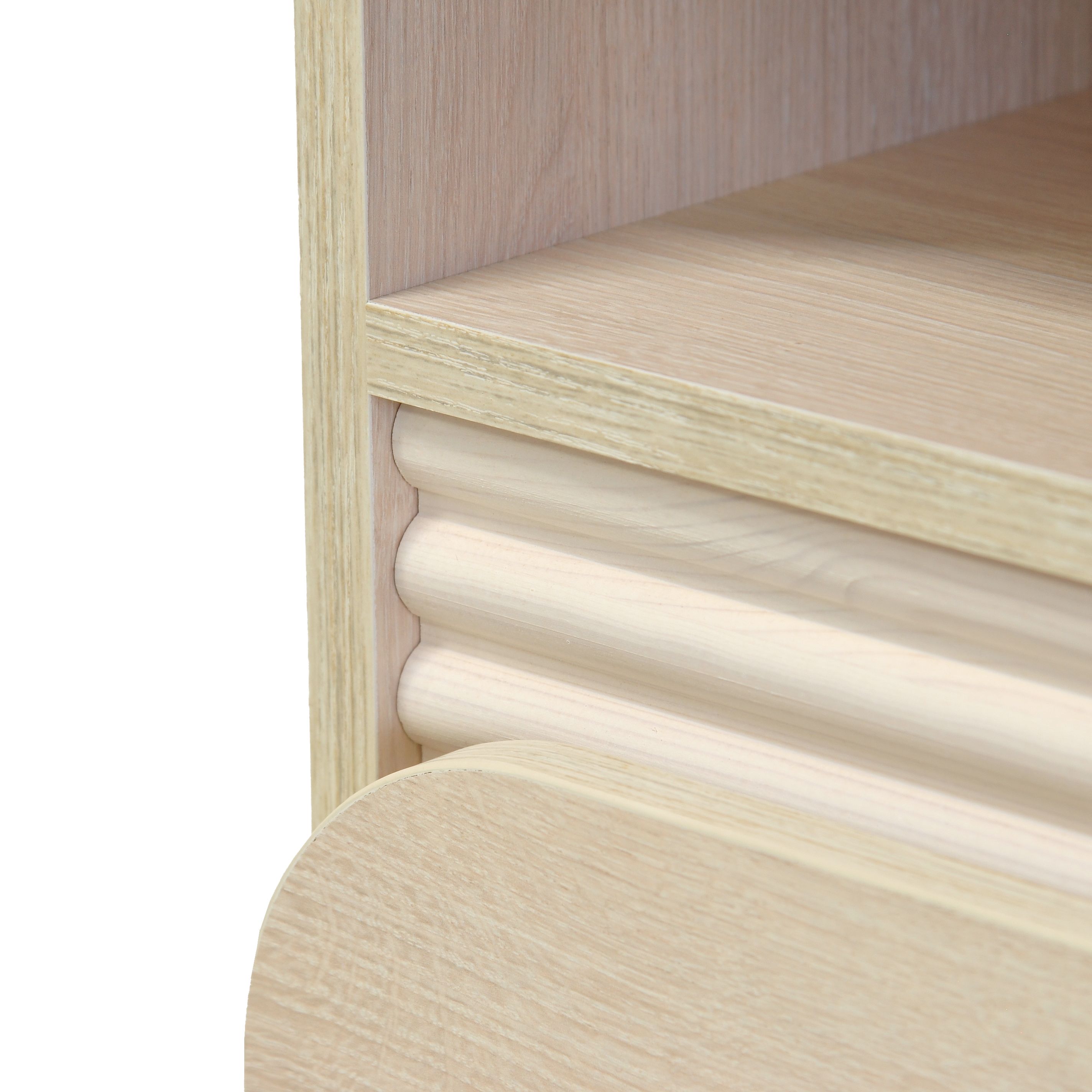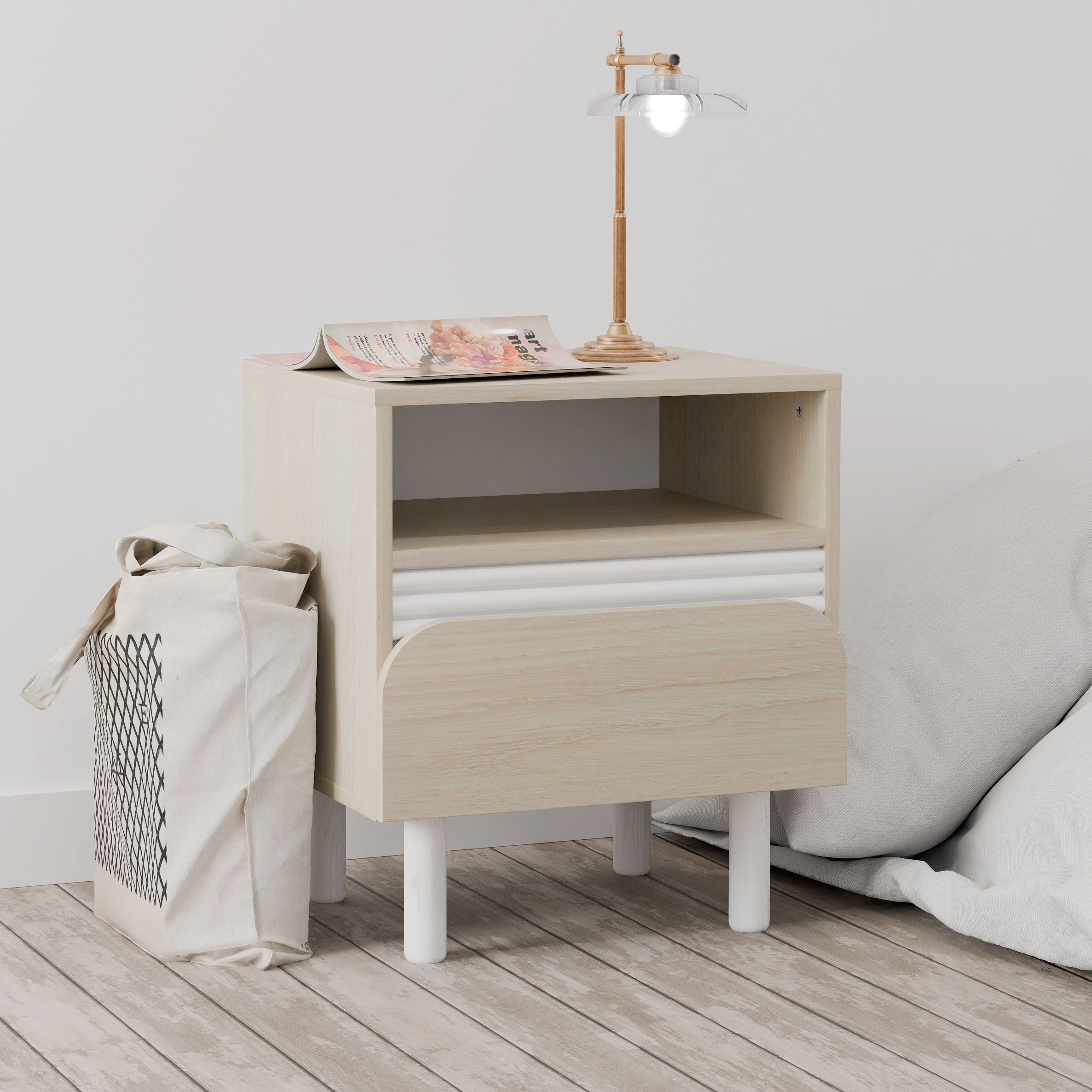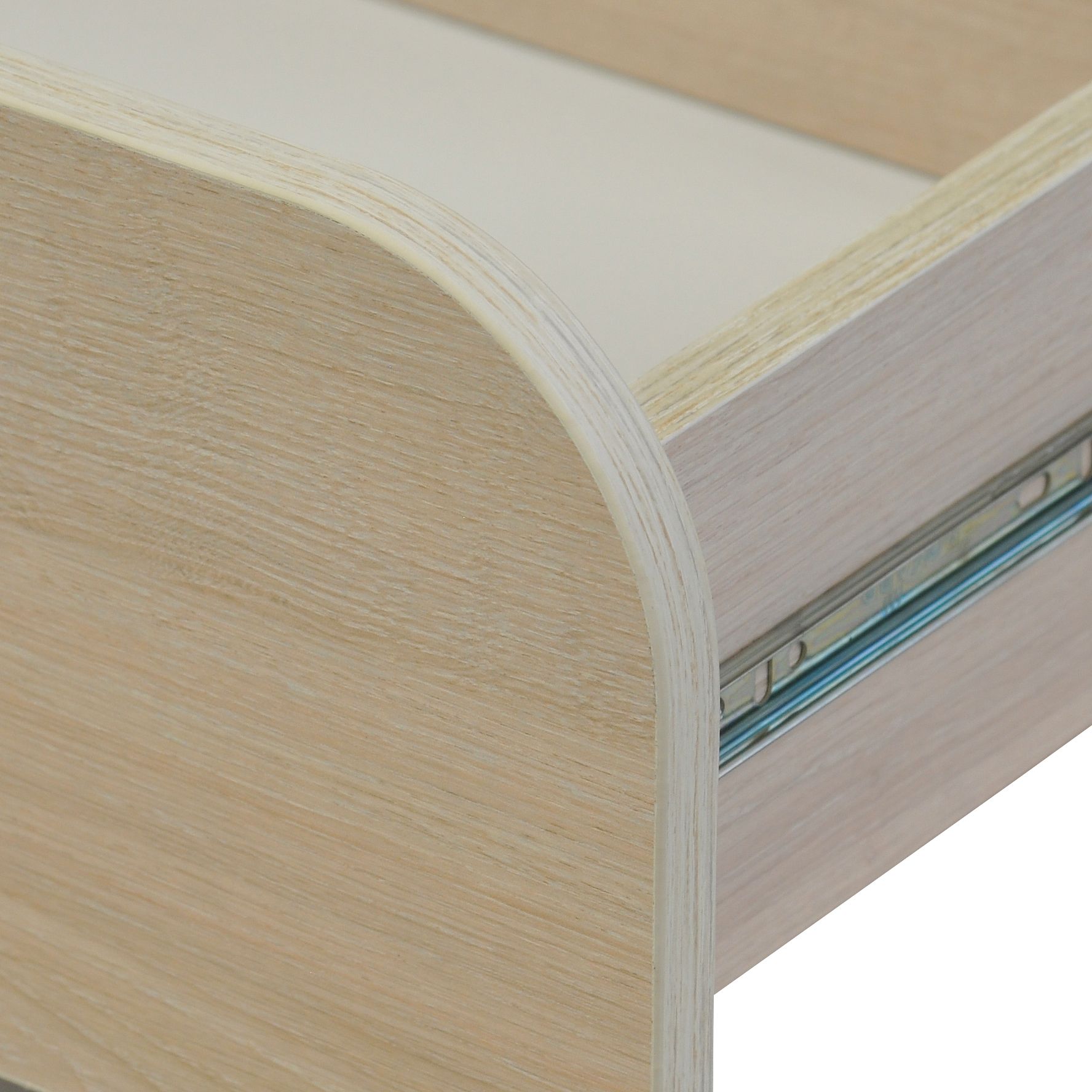 Прикроватная тумба выполнена из ЛДСП цвета дуб шамони 331 (толщ. 16 мм) и дополнена элементами из массива сосны в белом цвете. Для задней стенки использовалось ДВП белого цвета. Изделие выполнено на высокоточном оборудовании, все кромки аккуратно обработаны промышленным методом на современных станках, что обеспечивает плотное прилегание древесного слоя, устойчивость к влажности и деформации.