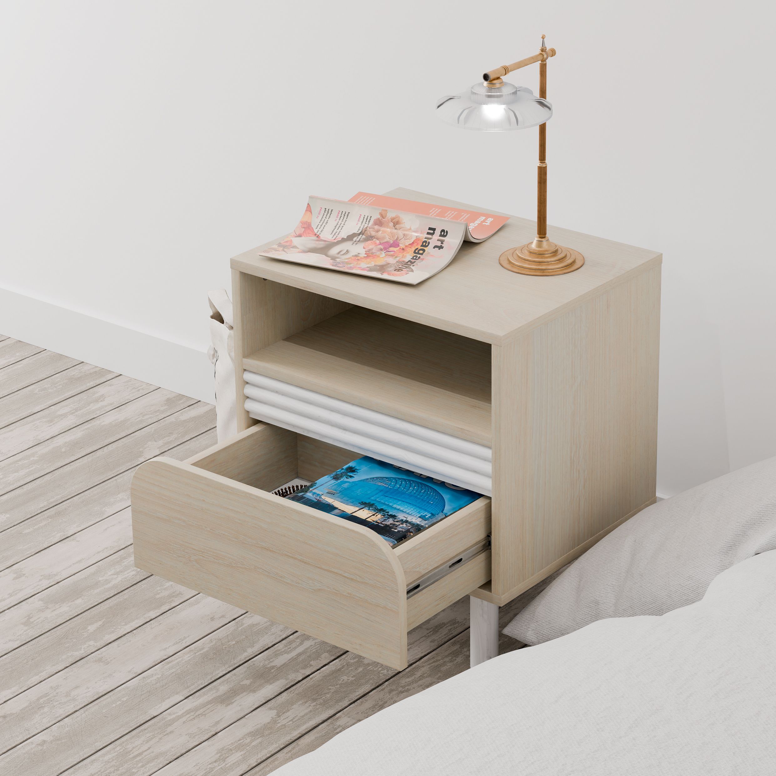 Напольная прикроватная тумба оснащена полкой и вместительным ящиком полного выдвижения, в котором удобно хранить мелочи — от книг до личных аксессуаров. Она станет прекрасным местом для размещения лампы, будильника или ваших любимых предметов декора. Ножки из массива сосны придают тумбе легкость и воздушность, а также обеспечивают надежную устойчивость. Закругленные фасады и декоративная планка из сосны, утопленная на 5 мм вглубь, позволят свободно открывать ящик.
