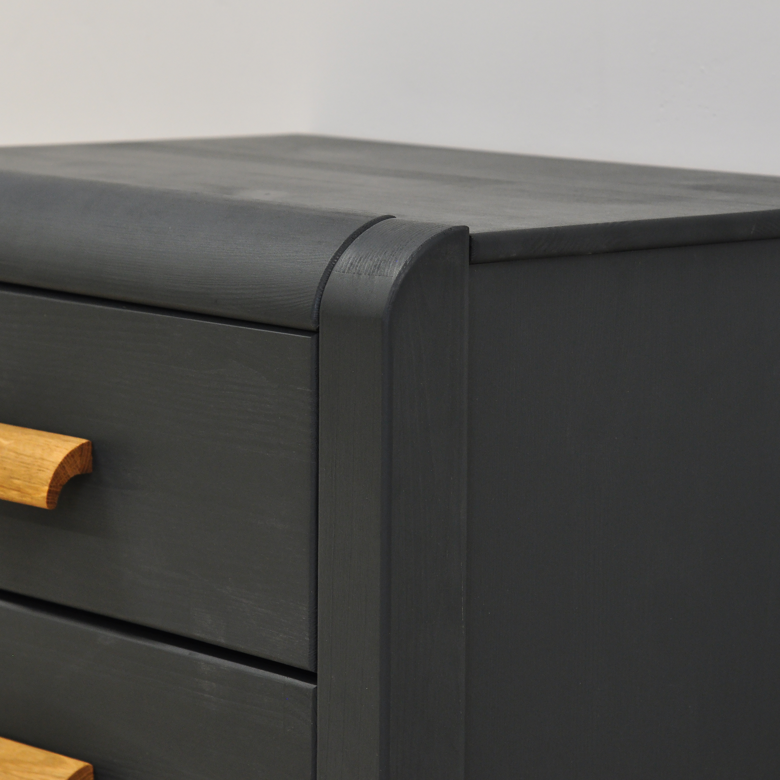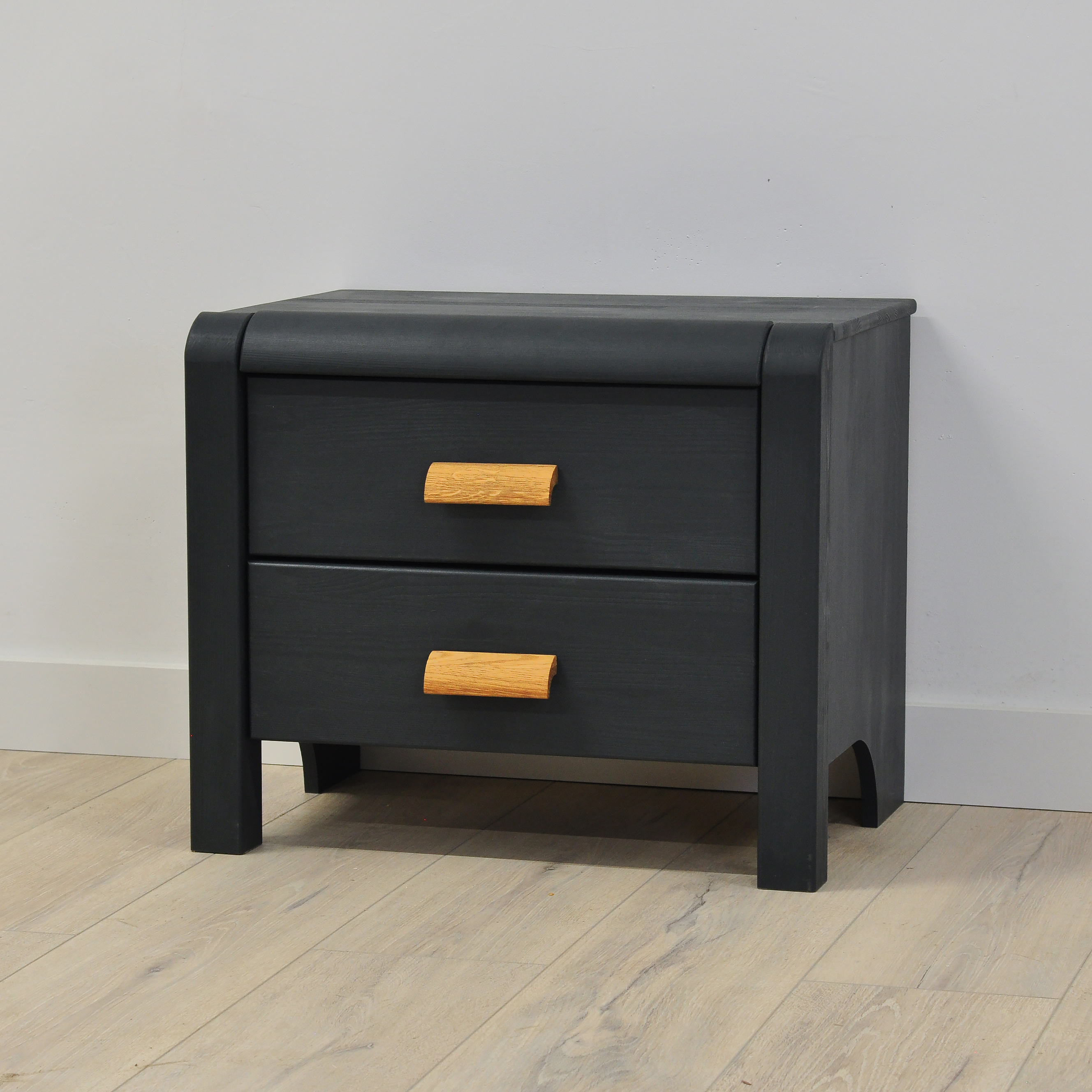 Тумба прикроватная напольная оснащена двумя вместительными ящиками полного выдвижения. Тумба прикроватная на ножках позволяет легко убирать пространство под ней. Ножки придают тумбе легкость и воздушность, а также обеспечивают надежную устойчивость. Ручки выполнены из массива дуба и придают изящности в контрасте с нежным серым цветом. Края тумбочки приятно сглажены.