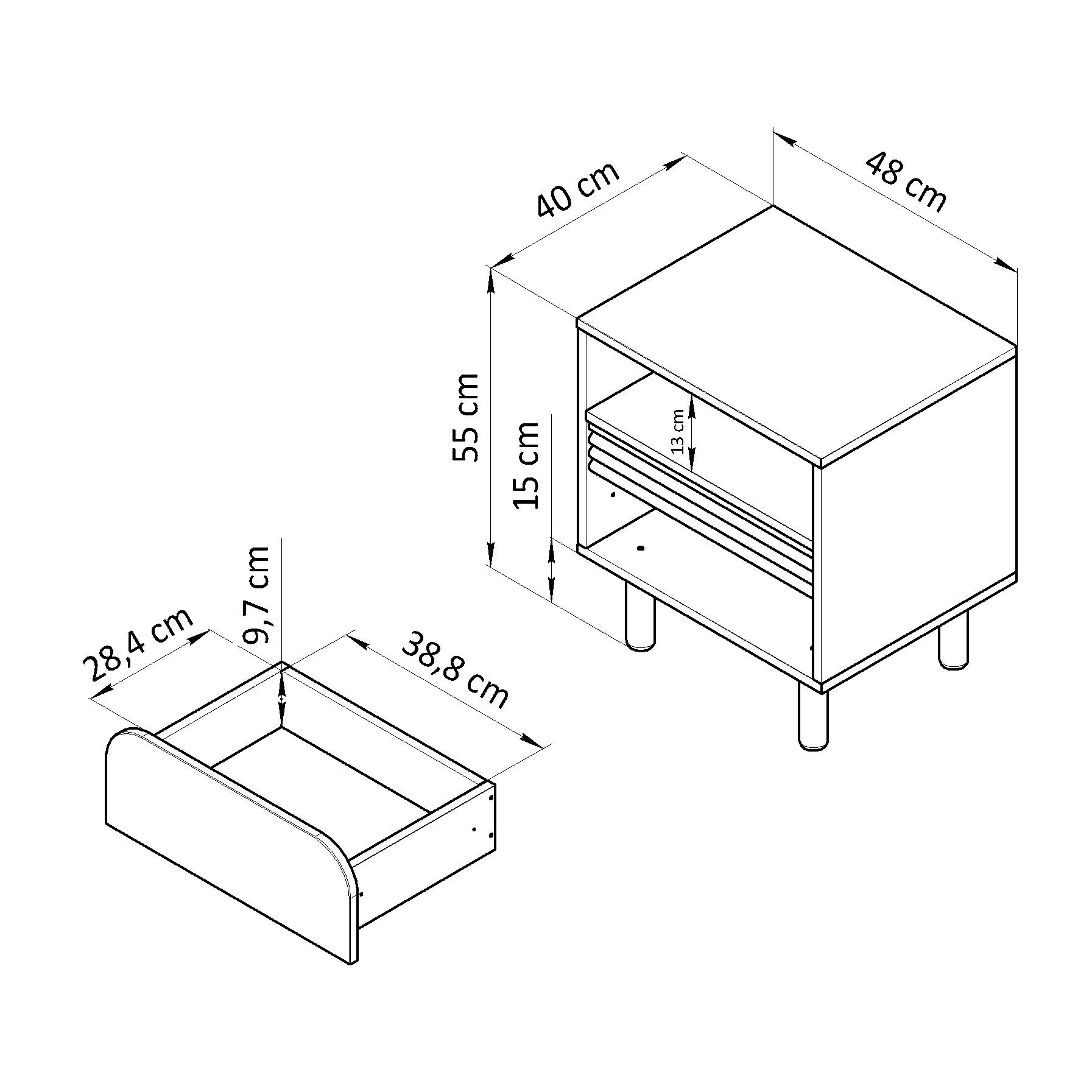 Напольная прикроватная тумба оснащена полкой и вместительным ящиком полного выдвижения, в котором удобно хранить мелочи — от книг до личных аксессуаров. Она станет прекрасным местом для размещения лампы, будильника или ваших любимых предметов декора. Ножки из массива сосны придают тумбе легкость и воздушность, а также обеспечивают надежную устойчивость. Закругленные фасады и декоративная планка из сосны, утопленная на 5 мм вглубь, позволят свободно открывать ящик.