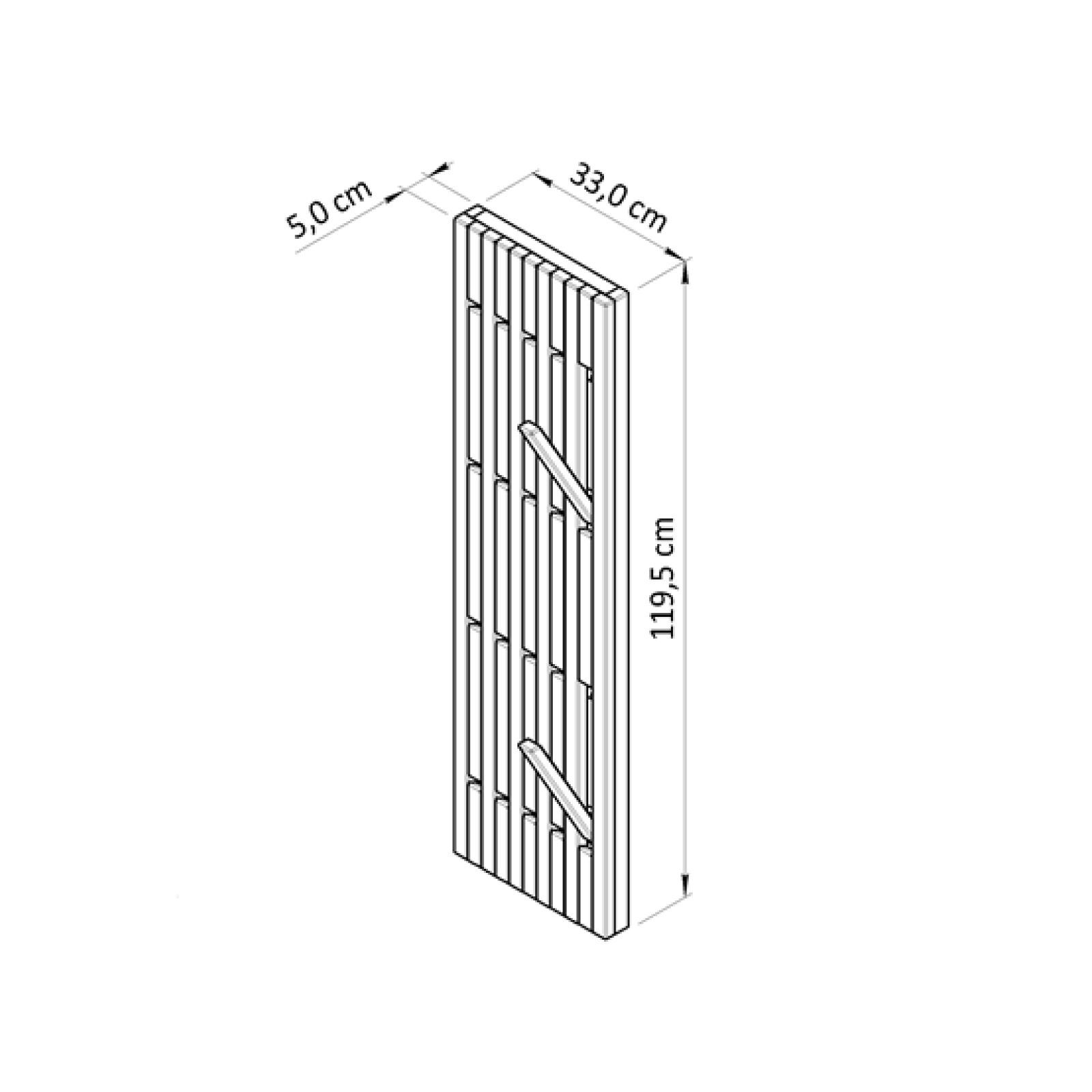 Материал - сосна, цвет - черно-белый, толщина дерева - сборная 30 мм + 20 мм. Размер крючков - 292х29х18 мм. Количество крючков – 10.