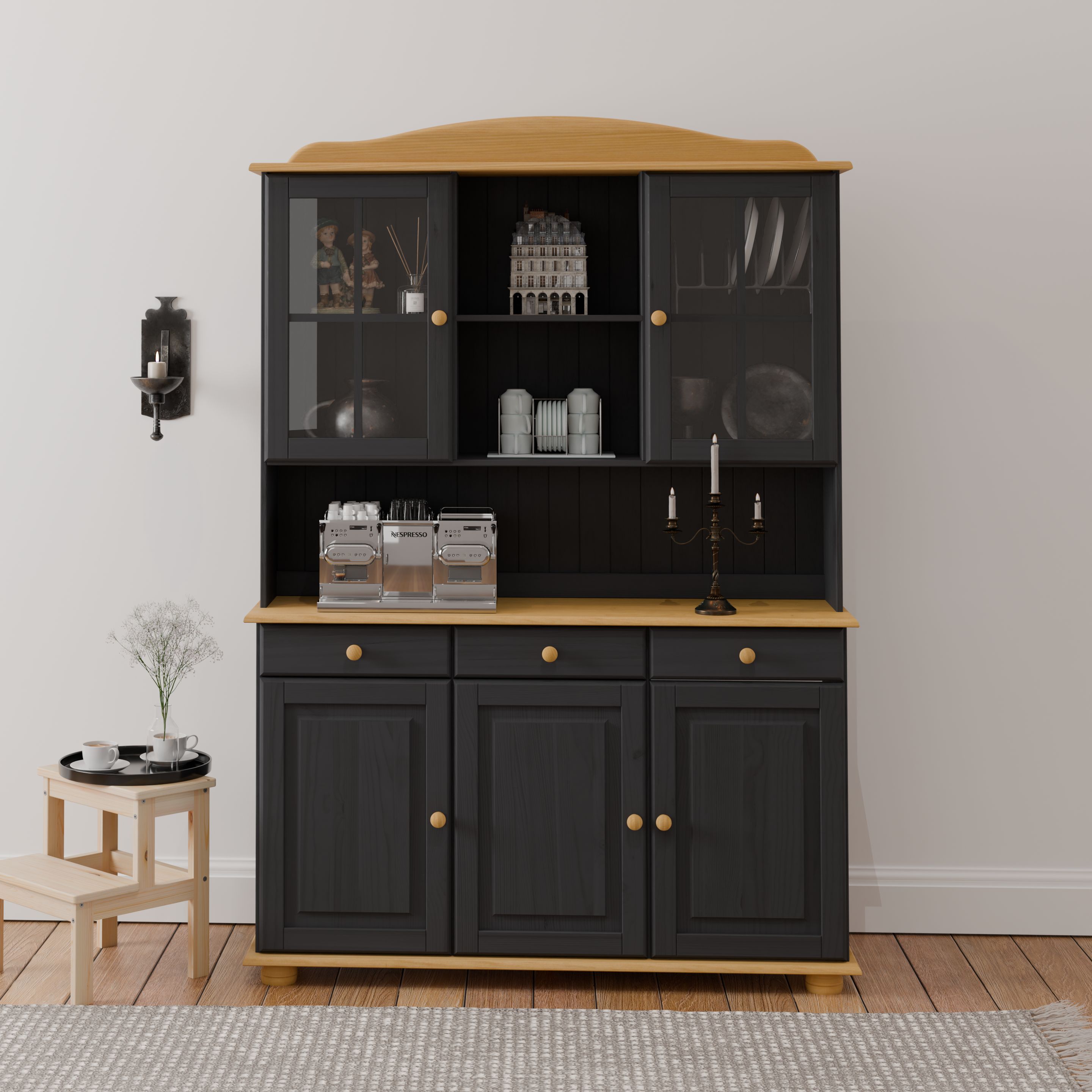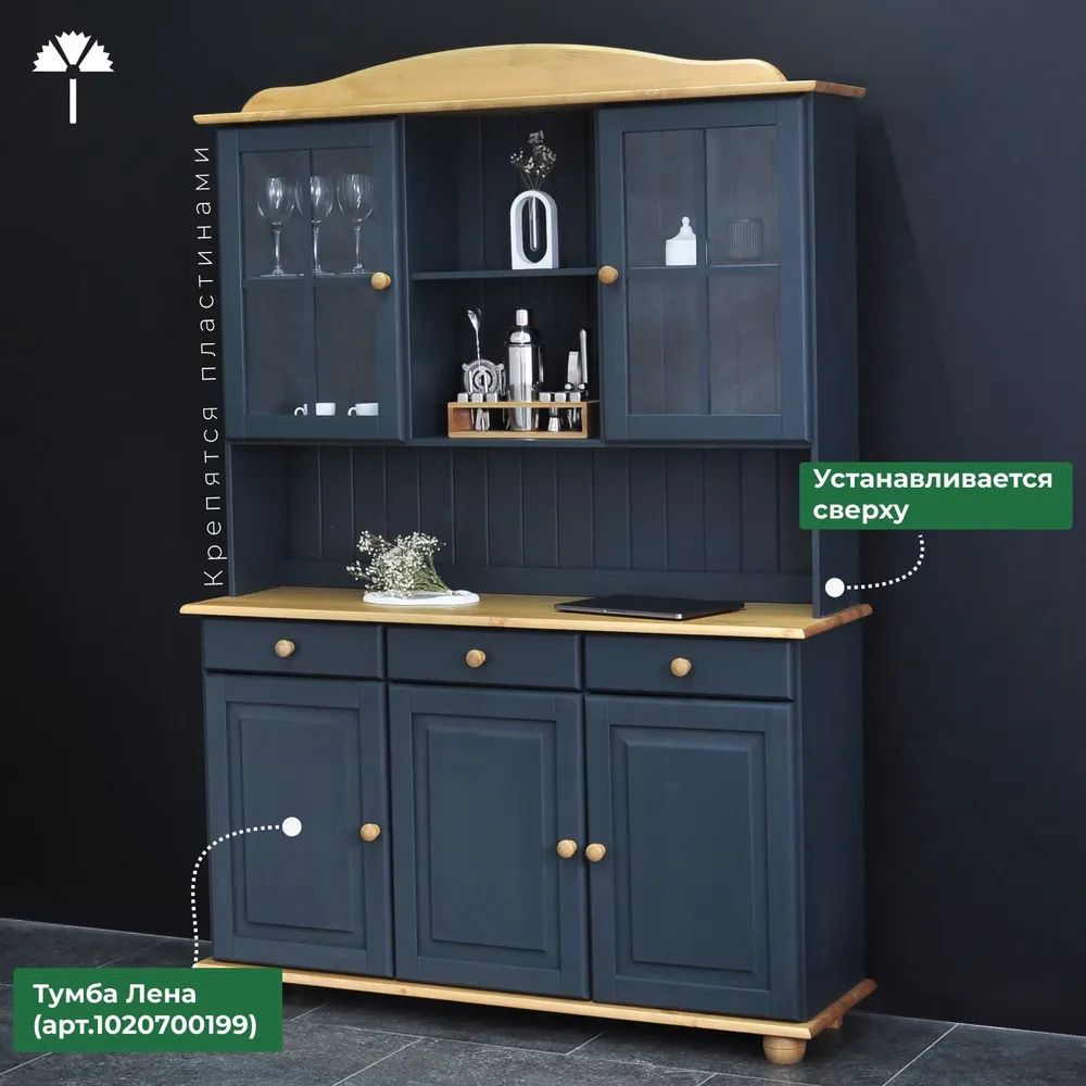Шкаф Лена (арт.1020734439) в комбинации с тумбой Лена (арт.1020700199) представляет собой модульный буфет, который прекрасно подойдет как для кухни, так и для столовой. Шкаф Лена выполнена из сосны от белорусского производителя "Диприз".