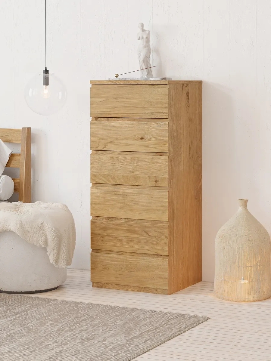 Конструкция комода включает в себя 6 вместительных ящиков, которые установлены с направляющими скрытого нижнего монтажа. Изделие изготовлено со скрытыми ручками, встроенными в фасад ящика. Благодаря вместительным ящикам, деревянный комод предоставляет достаточно места для хранения вещей и различных предметов, сохраняя при этом свою изысканную эстетику. Вы сможете использовать его для организации одежды и других объемных вещей. Максимальная допустимая нагрузка на ящик составляет до 5 кг.