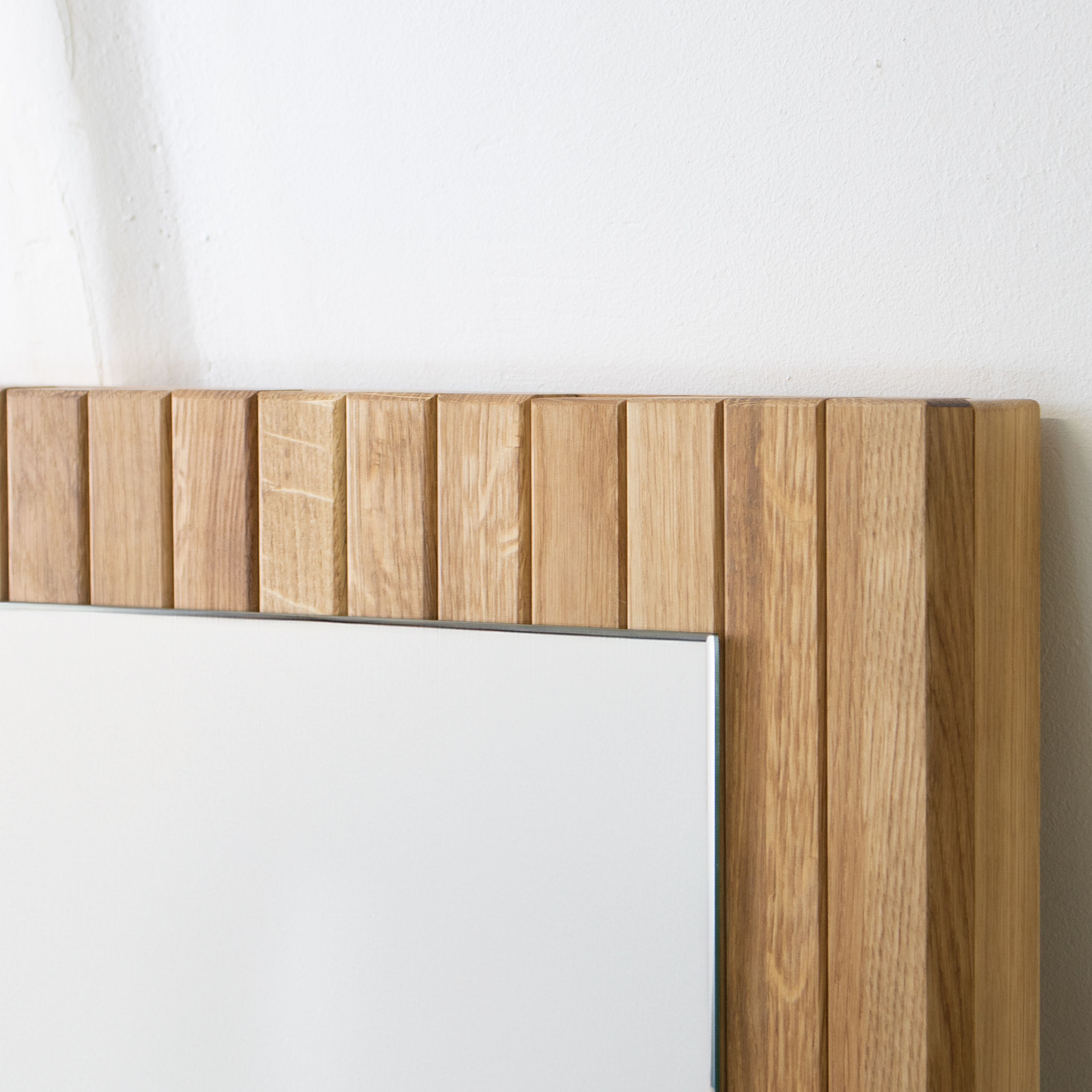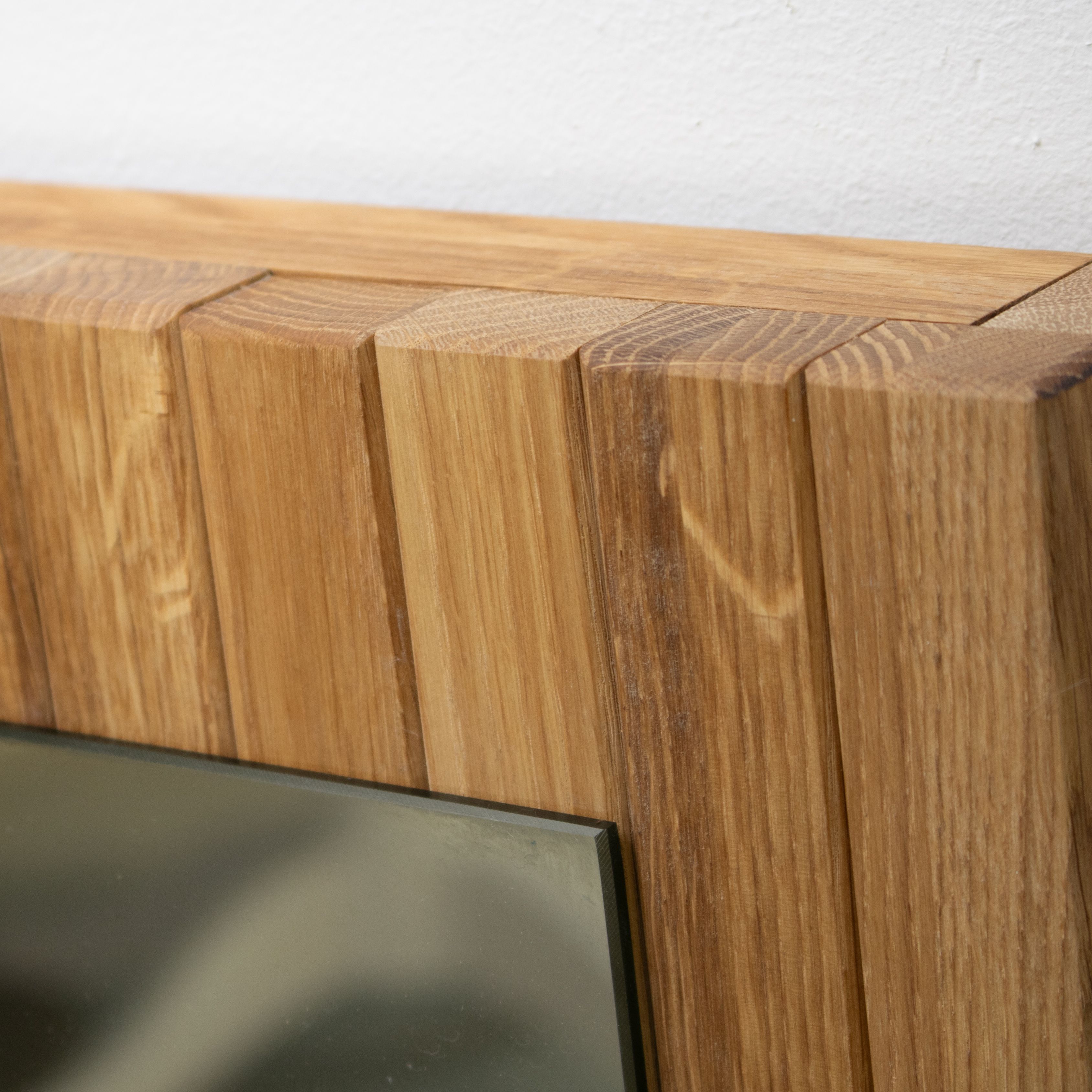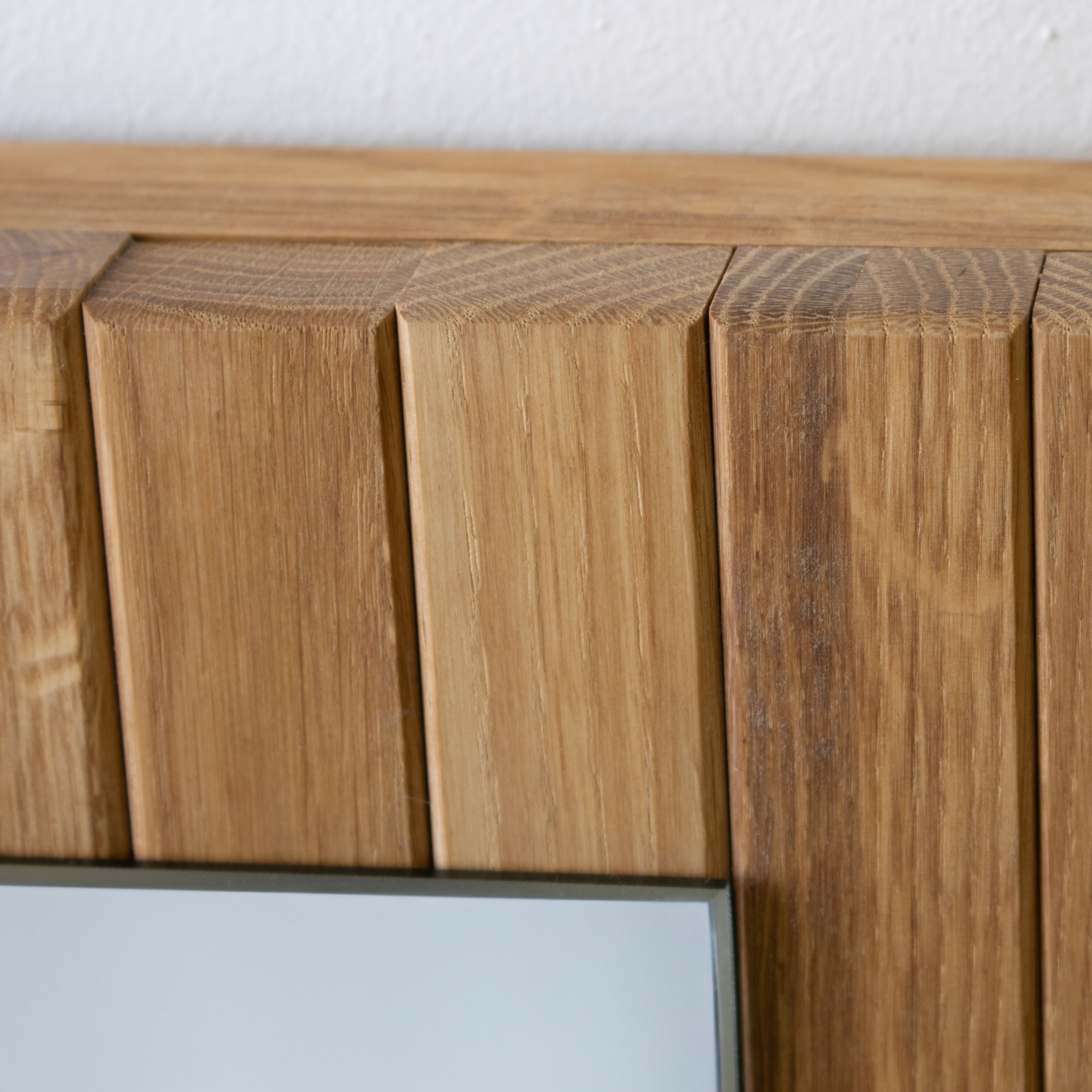 Вертикальные рейки из массива дикого дуба покрытые маслом. Массив дикого дуба обладает аутентичным природным видом, где сучки и уникальные текстуры древесины максимально сохранены. Благодаря этому, каждое зеркало становится уникальным, и вы сможете каждый день наслаждаться частичкой природы у себя дома, создавая атмосферу уюта и гармонии.