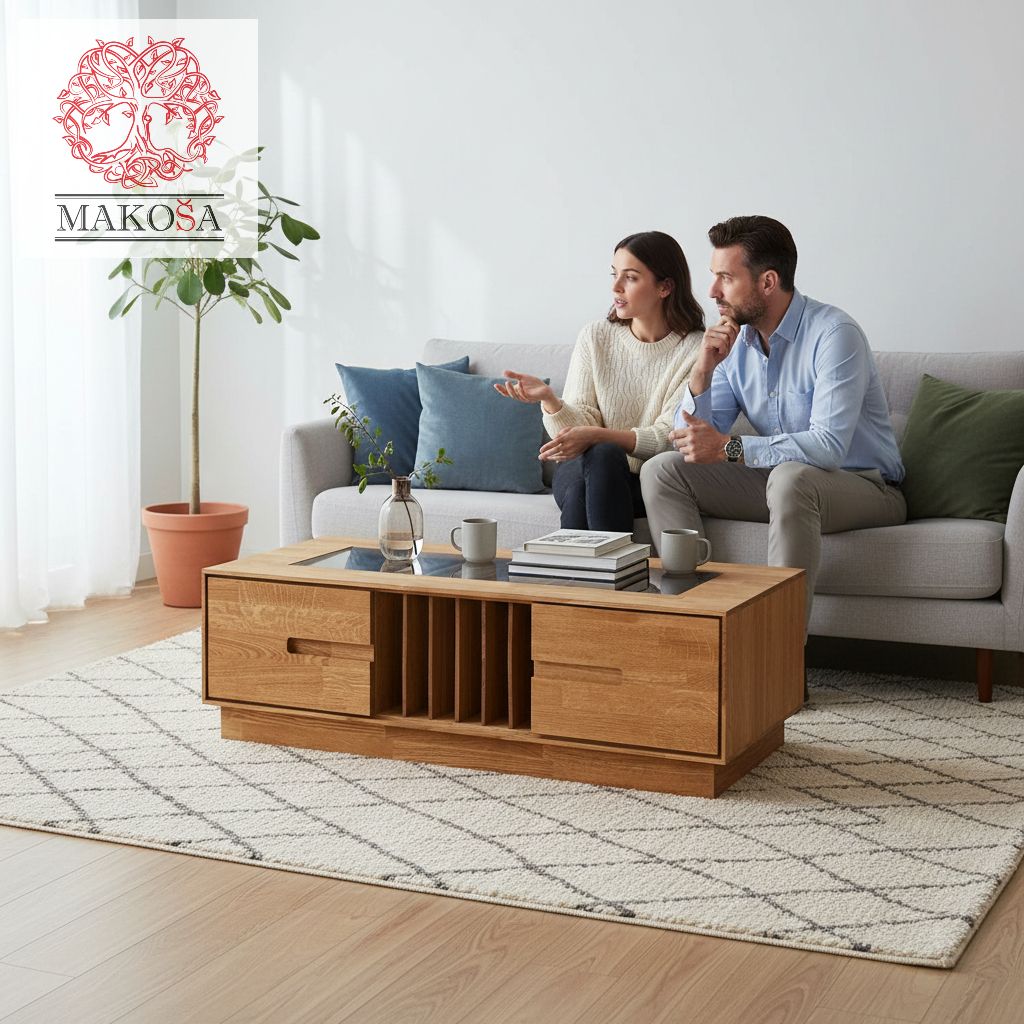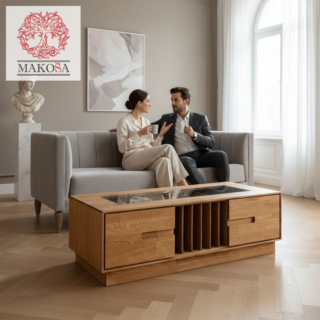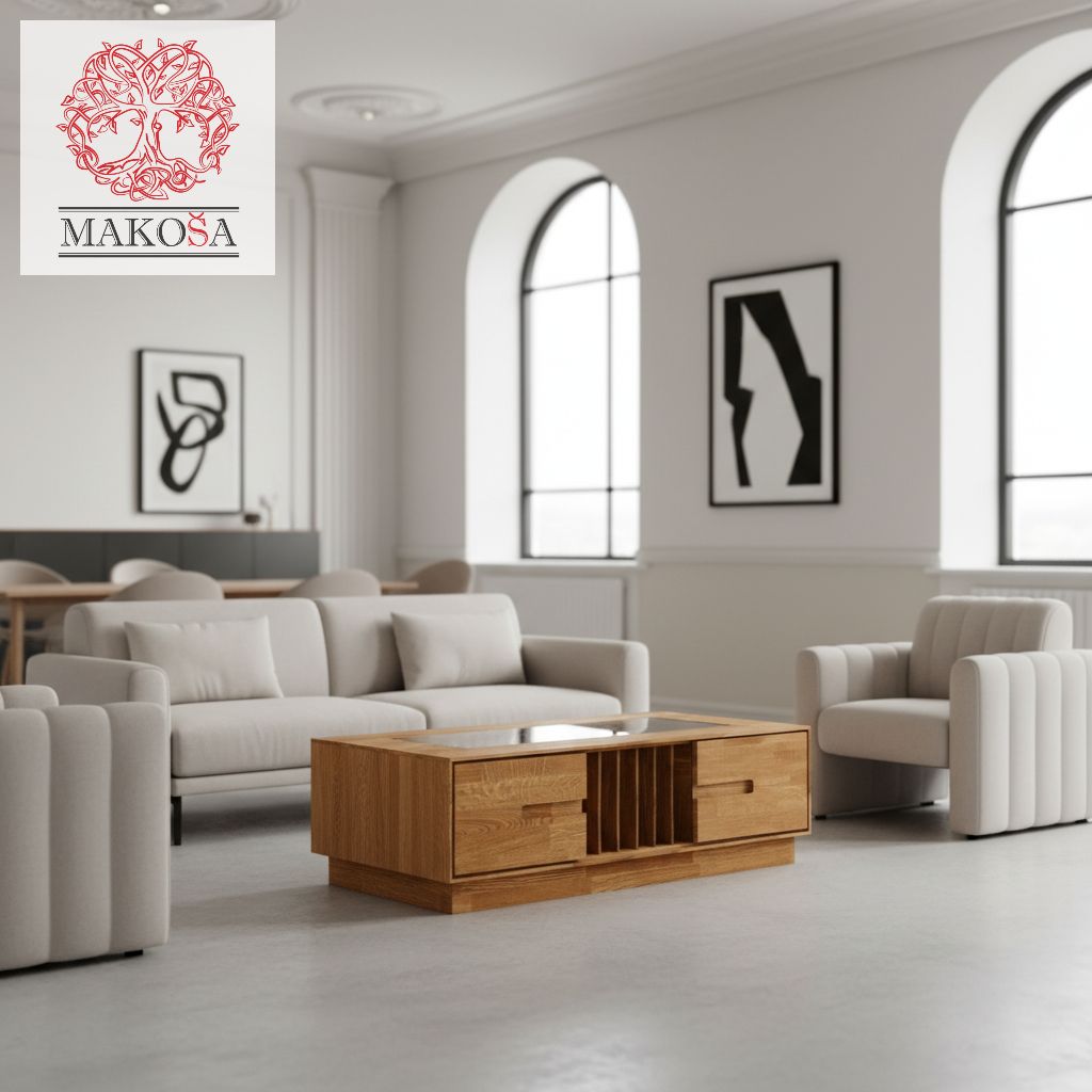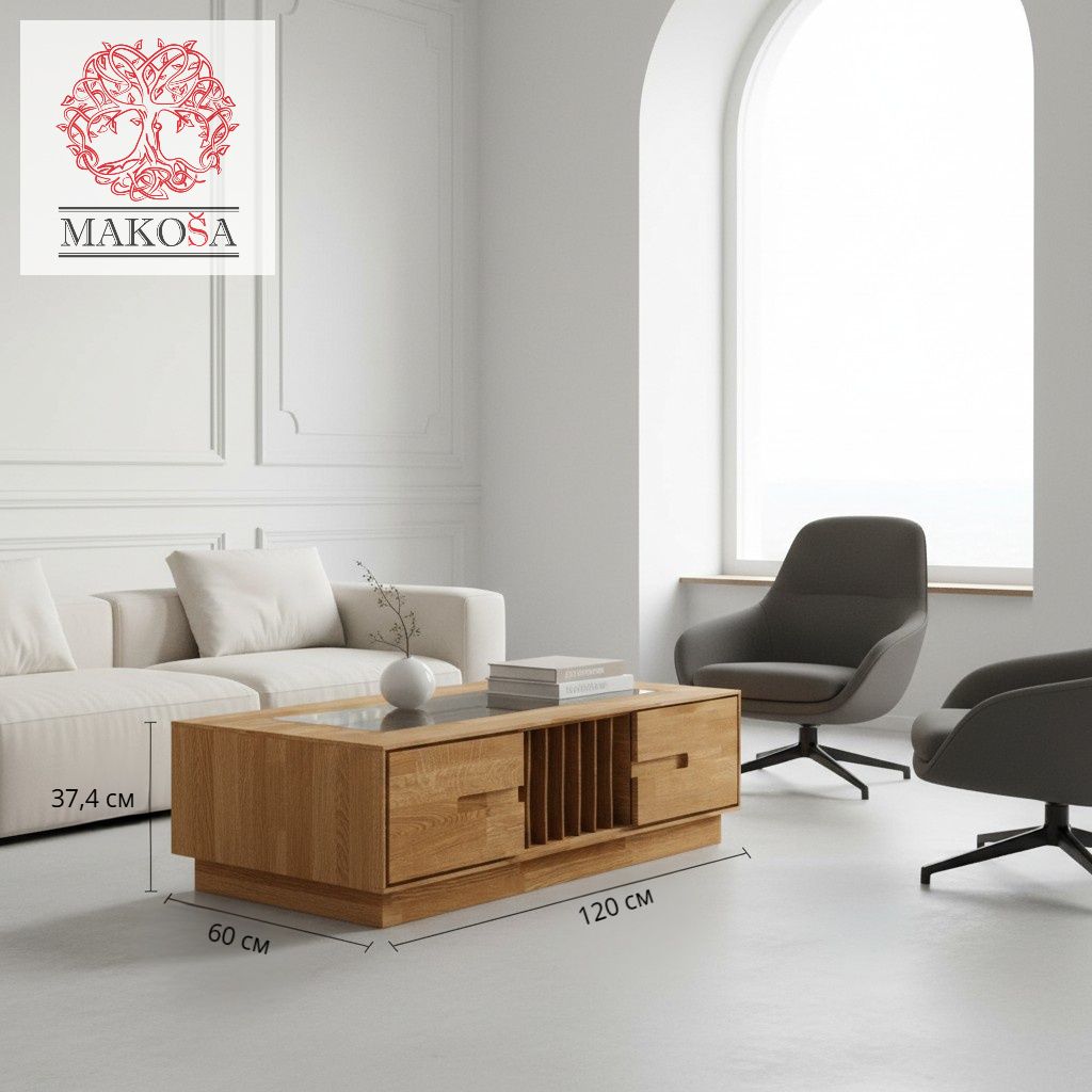 Бренд Makosa представляет премиальную модель журнального стола «Паво» в стиле модерн. Уникальное сочетание массива дуба, обработанного натуральным льняным маслом, и закаленного стекла создает эффектный предмет интерьера, подчеркивающий ваш исключительный вкус.