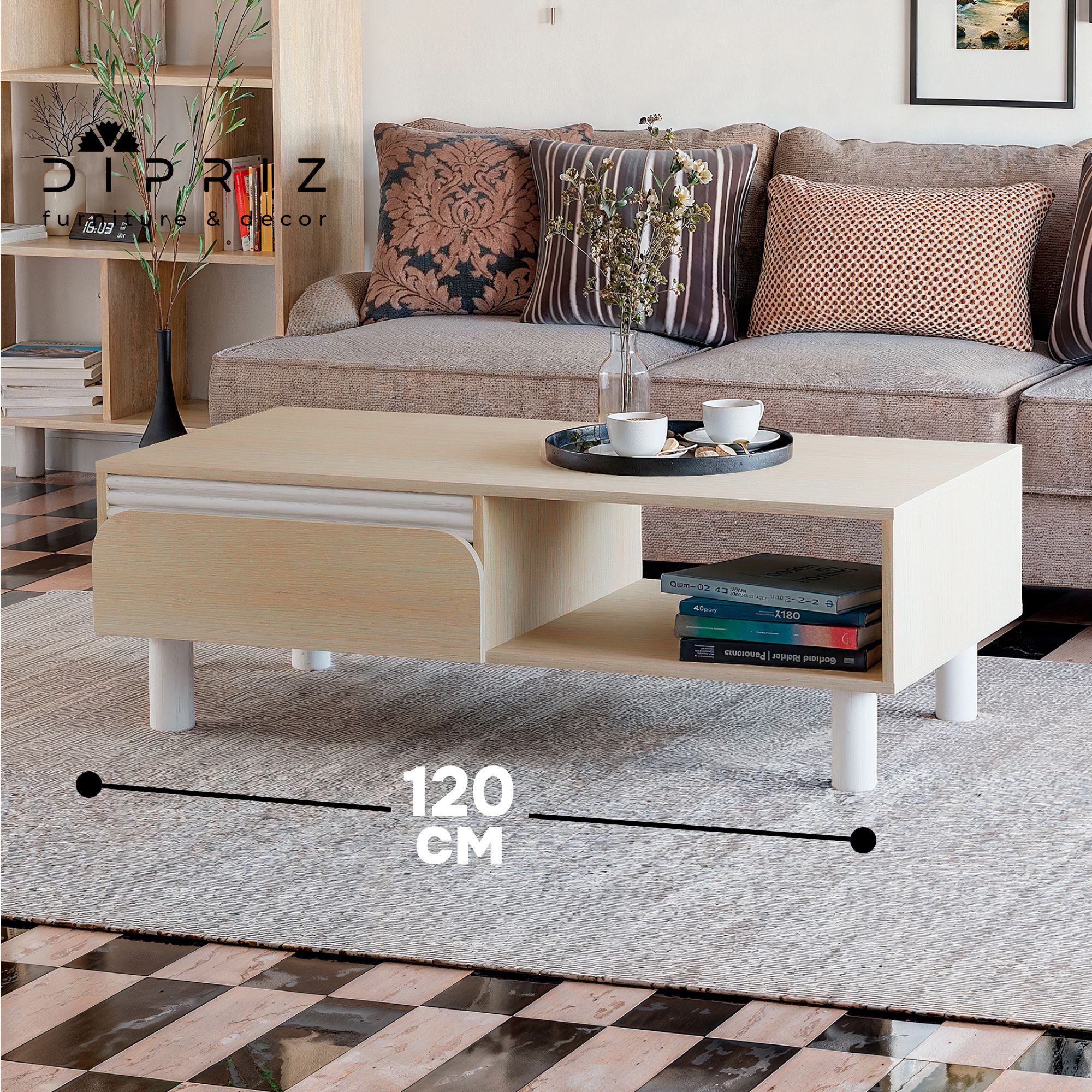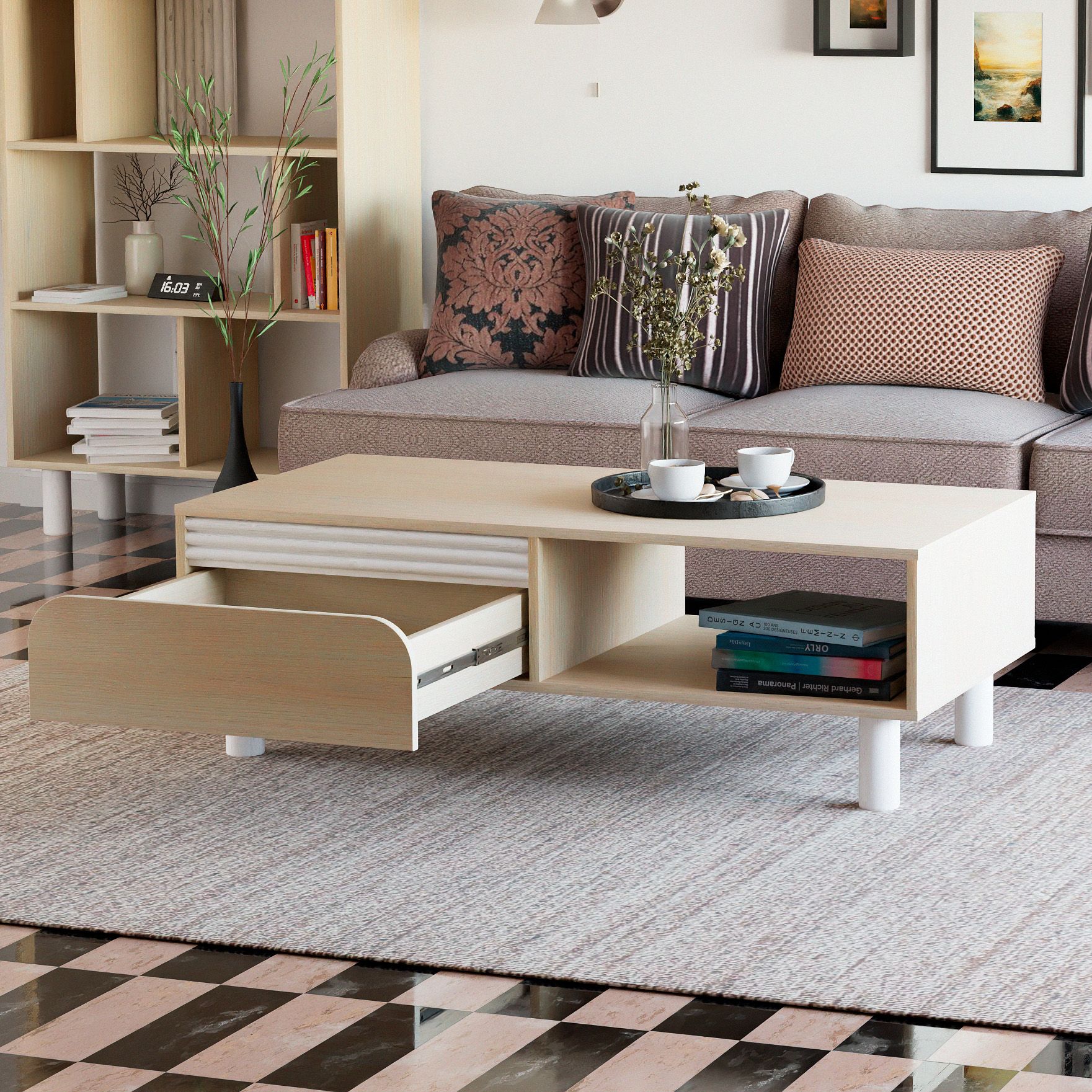 Особенностью кофейного столика является его наличие просторной полки и ящика под столешницей, которая расширяет пространство и возможности использования мебели. Столешница из ЛДСП дуб шамони имеет свою неповторимую текстуру и цветовую гамму, делая журнальный стол по-настоящему уникальным произведением искусства.